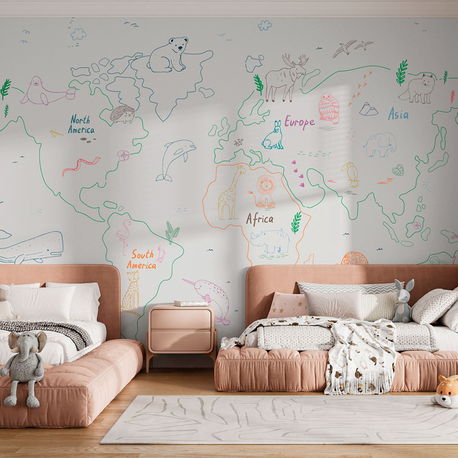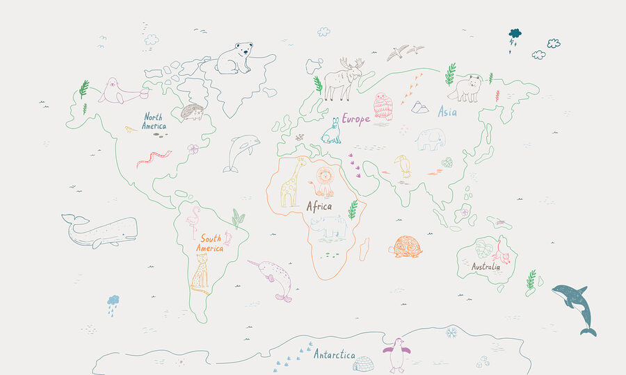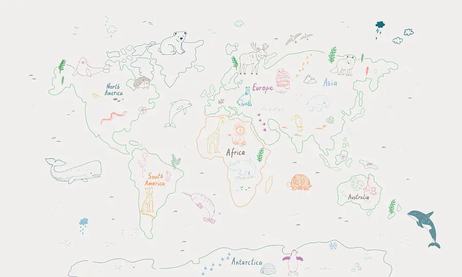 Wyobraź sobie, że każdego ranka budzisz się na spotkanie przygody z fototapetą w01502v1! Jest to zachwycająca odrobina kaprysu, łącząca mapy ziemi z uroczymi bazgrołami zwierząt. Idealne do pokoju dziecięcego lub dla każdego młodego duchem. Każdy kontynent ma swoją własną kreatywną załogę – lwy wylegujące się w Afryce, pingwiny chłodzące się na Antarktydzie i nie tylko. Przyjaciele i rodzina pokochają śledzenie tych zabawnych ilustracji palcami, pobudzając ciekawość naszego świata. To połączenie edukacji i sztuki – coś w rodzaju przytulnego globalnego polowania na padlinożerców bezpośrednio na ścianie!