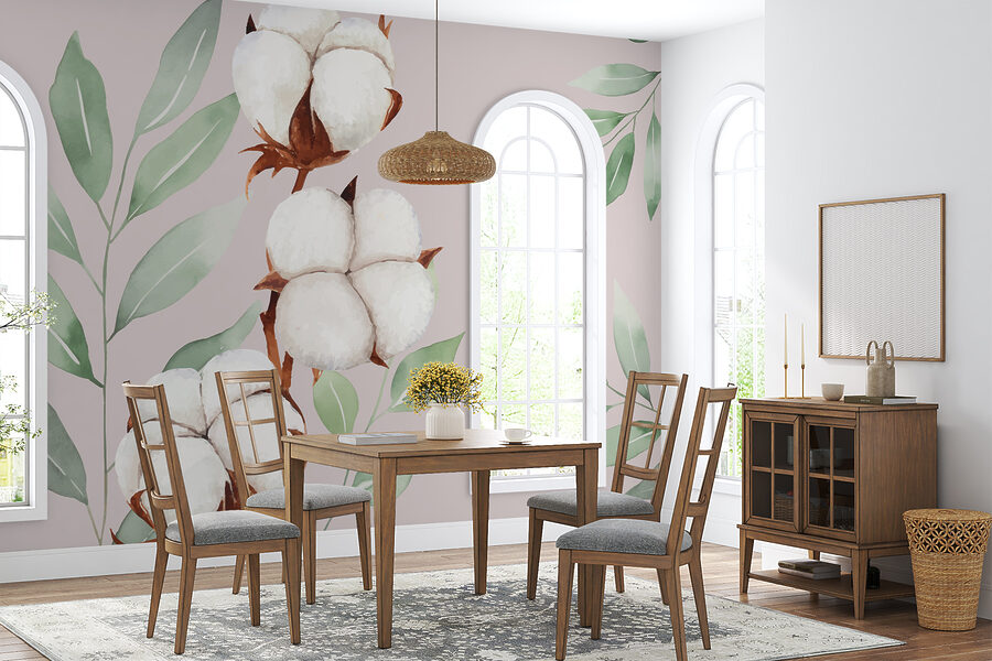 Fototapeta ścienna “Cotton Flowers and Leaves” jest jak zaproszenie szeptu natury prosto do salonu. Wyobraź sobie scenerię z tymi miękkimi, puszystymi bawełnianymi kwiatami i wdzięcznymi zielonymi liśćmi – to jak delikatny uścisk dla twoich ścian. Idealny dla każdego, kto kiedykolwiek marzył o posiadaniu ogrodu botanicznego, ale bez konewki! Idealny do stworzenia spokojnego zakątka, w którym poranna kawa smakuje nieco bardziej magicznie. Dobrze komponuje się z przytulnymi kocami, dobrymi książkami i marzeniami o słonecznych polach.