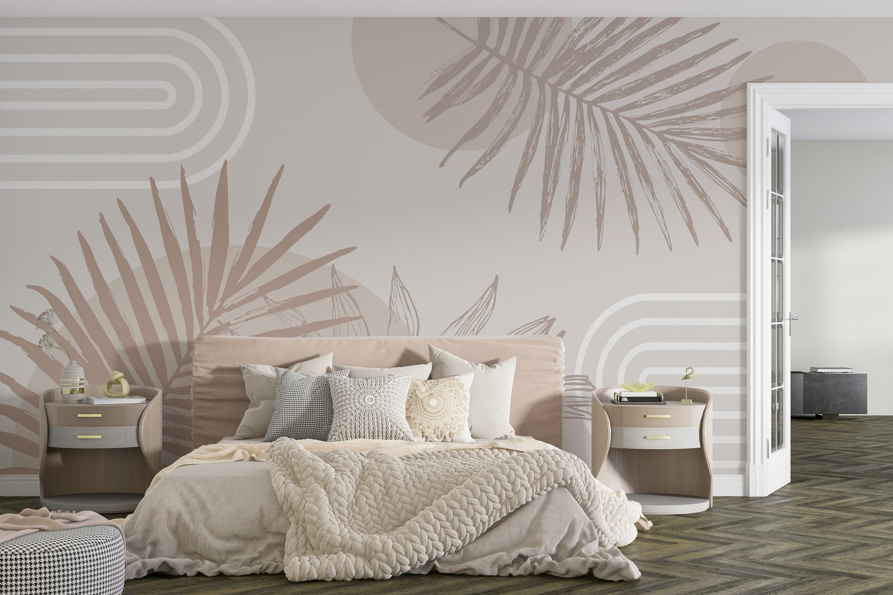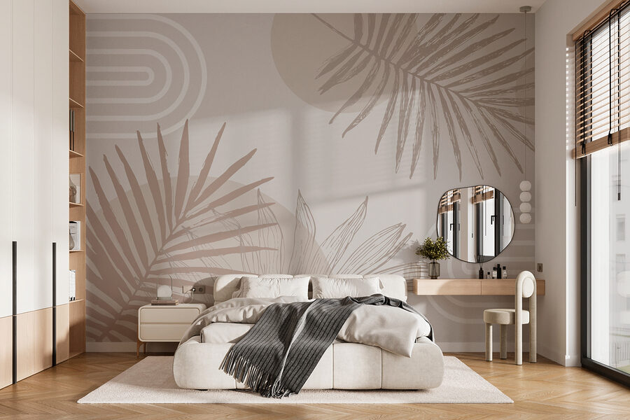 Sprawdź tę fantastyczną fototapetę – to wszystko w neutralnych odcieniach z zabawnymi geometrycznymi kształtami i liśćmi palmowymi. Wyobraź sobie: leniwy niedzielny poranek, kawa w ręku, wygrzewanie się w spokojnej atmosferze, którą wprowadza ta fototapeta. To jak mini-wakacje bezpośrednio na ścianie. Idealny dla tych, którzy pragną odrobiny tropików bez jet lagu. Niezależnie od tego, czy odnawiasz swój salon, czy urządzasz domowe biuro, ten wzór doda odrobinę stylu, szepcząc jednocześnie: “Zrelaksuj się, jesteś w domu”. Twoje ściany to pokochają!