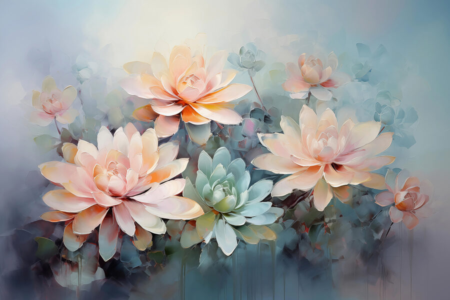 Wyobraź sobie, że budzisz się w sennym, błękitnym świecie, w którym kwiaty wybuchają jak akwarelowe fajerwerki na twoich ścianach. Ta fototapeta ma miękkie jak serce płatki w różowych i miętowych odcieniach tańczące na delikatnej bryzie, praktycznie szepczące słodkie nuty. Idealna do przytulnych zakątków lub spokojnego kącika do czytania – to jak przyjęcie w ogrodzie dla twoich oczu. Przyjaciele mogą nawet zatrzymać się w połowie zdania, aby się nim nacieszyć. Idealny dla każdego, kto pragnie odrobiny kapryśnej elegancji połączonej z urokiem Matki Natury. A może nawet odrobiny magii!