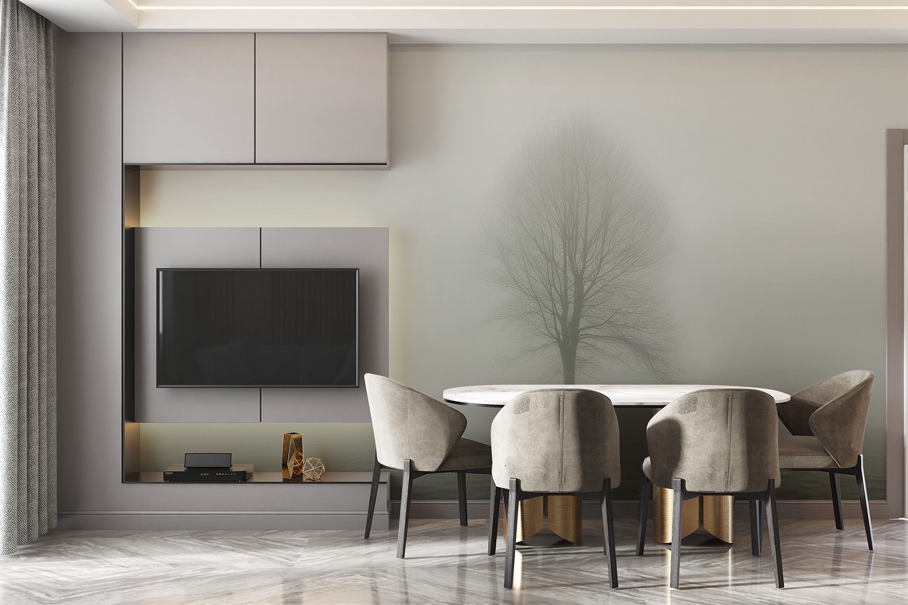 Wyobraź sobie, że wchodzisz do swojego pokoju i znajdujesz się na spokojnym, zamglonym polu. “Tree in a Foggy Field” to nie tylko mural, to chwila – jak te spokojne, mgliste poranki, kiedy świat wydaje się szeptany i miękki. Możesz nawet chcieć zwinąć się w kłębek z dobrą książką lub po prostu wyłączyć się na chwilę, pozwalając ciszy owinąć się wokół ciebie jak ulubiony sweter. To rodzaj sceny, która zakrada się do ciebie, sprawiając, że wzdychasz z zadowoleniem lub nagle pragniesz gorącej filiżanki herbaty. Odrobina magii na ścianach!