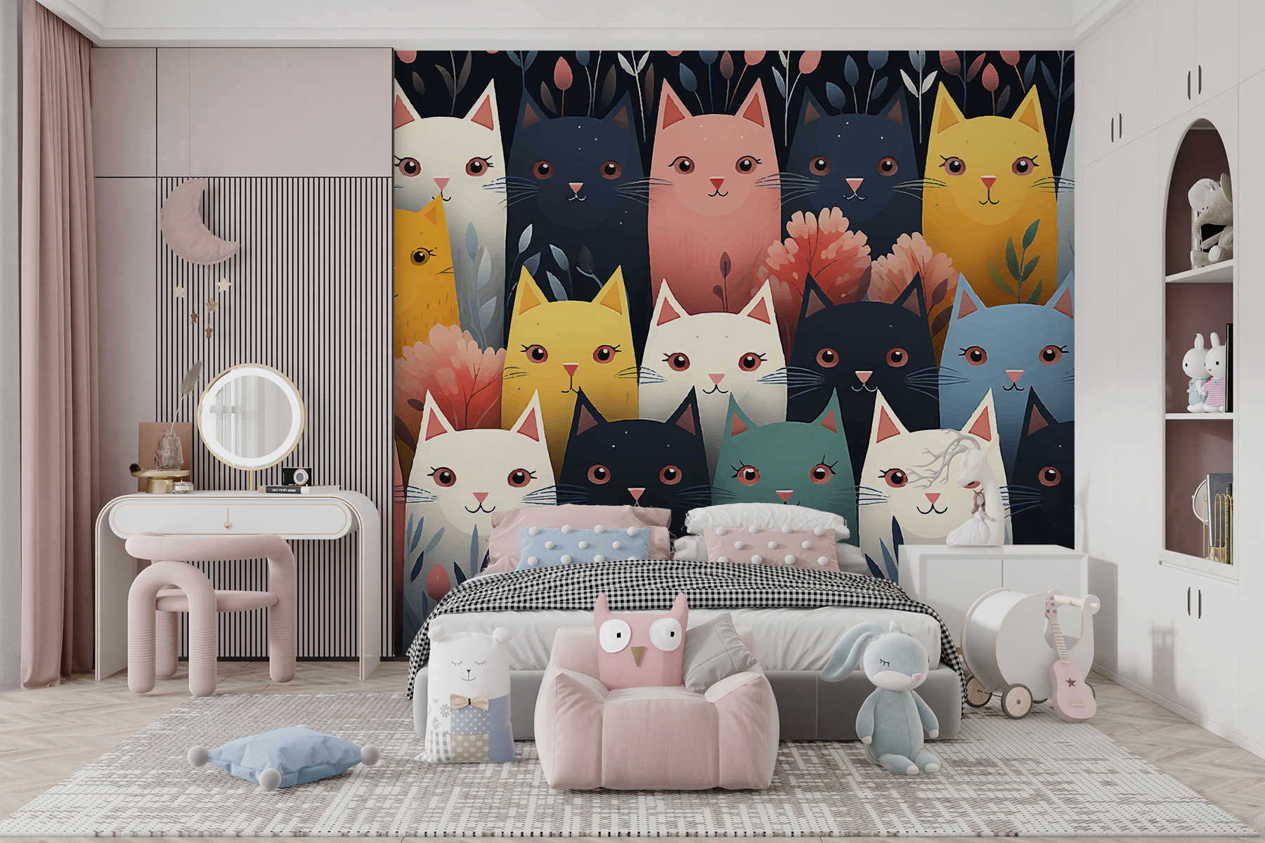 Chcesz dodać trochę kaprysu do swojej przestrzeni? Sprawdź tę zabawną fototapetę o nazwie “Grupa kotów z kwiatami”. Wyobraź sobie ekipę kolorowych kotków – jasnych różów, zieleni i żółci – usadowionych wśród wesołych kwiatów. To jak przyjęcie w ogrodzie, ale z kotami! Idealne dla każdego, kto kocha odrobinę koloru i radości. Ci koci przyjaciele wnoszą urok i nutkę psoty do każdego pomieszczenia, łaskocząc kreatywnego ducha za każdym razem, gdy przechodzisz obok. Myślisz o stworzeniu przytulnego kącika? Te koty mają twoje plecy – a przynajmniej twoją ścianę!