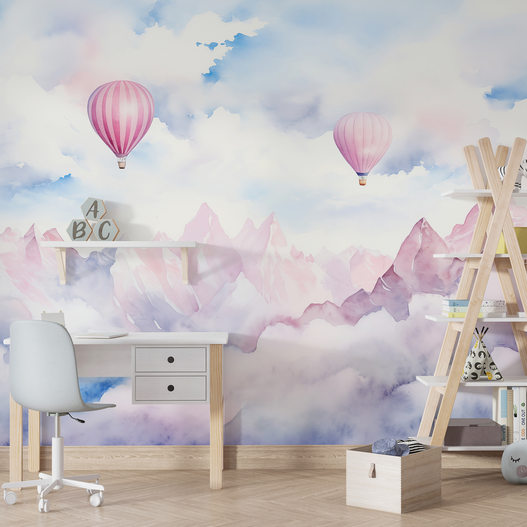 Wyobraź sobie, że budzisz się i popijasz poranną kawę, a na ścianie unosi się para balonów na ogrzane powietrze. Bogate, akwarelowe odcienie oddają lekką i zwiewną atmosferę idealnego dnia ponad chmurami. Ta fototapeta to nie tylko dekoracja – to jak okno do czarującego, spokojnego świata. Ma w sobie magiczną atmosferę wędrówki bez wychodzenia z domu. Idealna dla marzycieli i poszukiwaczy przygód! Odrobina górskiego majestatu i łagodnego nieba… to jak własna przytulanka natury na ścianach.