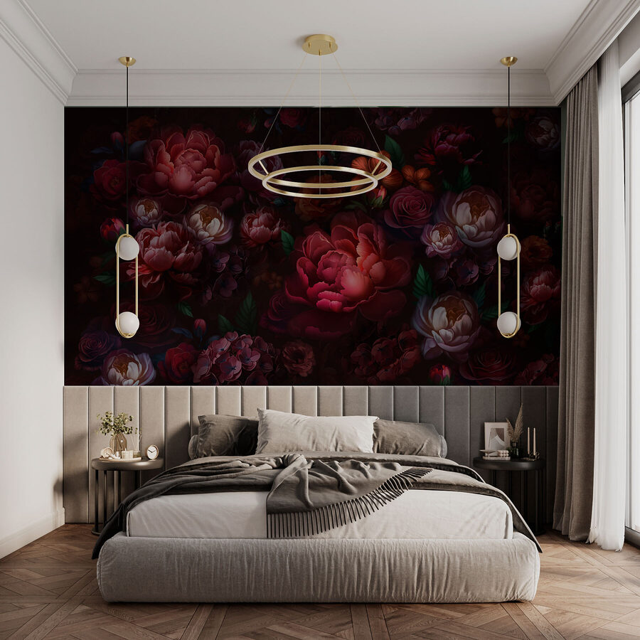 Wkrocz do świata, w którym kwiaty nigdy nie więdną. Ta fototapeta z bujnymi kwiatami na ciemnym tle przypomina wejście do czarującego wieczornego ogrodu. Wyobraź sobie bogate czerwienie i subtelne biele tańczące na ścianach, szepczące elegancję i odrobinę tajemniczości. Idealny do przekształcenia zwykłego pokoju w bujne sanktuarium. To jak posiadanie własnej kwiatowej krainy czarów – bez potrzeby posiadania zielonych kciuków lub częstego podlewania! Świetnie nadają się do dodania przytulności i uroku, są zarówno szykowne, jak i ponadczasowe. Przyjaciele mogą po prostu zgubić się, wpatrując się w nią, zastanawiając się nad głębokimi myślami – lub nad tym, co jest na obiad.