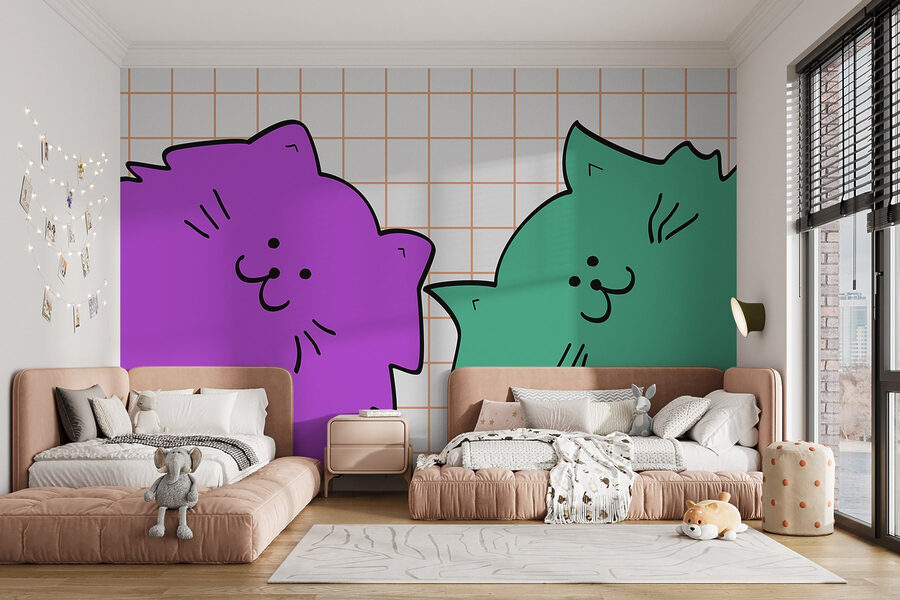 Wyobraź sobie dwa puszyste koty wylegujące się na ścianie, pomalowane w zachwycających odcieniach fioletu i zieleni. Ta fototapeta jest nie tylko dla miłośników kotów; to odrobina kaprysu, która sprawi, że każdy pokój poczuje się jak przytulna kryjówka. Wyobraź sobie: wchodzisz po długim dniu, a te dwa pastelowe kociaki witają cię swoją radosną aurą. To tak, jakby szeptały: “Odciąż się, przyjacielu”. Idealna do zabawnego salonu lub dziwacznego kącika w kawiarni, ta fototapeta to najlepszy sposób na rozpoczęcie rozmowy. I hej, nie wymaga kuwety!