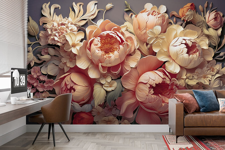 Wyobraź sobie, że wchodzisz do przestrzeni, w której na ścianach kwitną żywe piwonie, niczym na wiecznym przyjęciu w ogrodzie. Ta fototapeta, z miękkim szarym tłem, doskonale podkreśla żywe kolory kwiatów, sprawiając, że czujesz się świeżo i zachęcająco. To jak powiew wiosny, niezależnie od pory roku na zewnątrz.