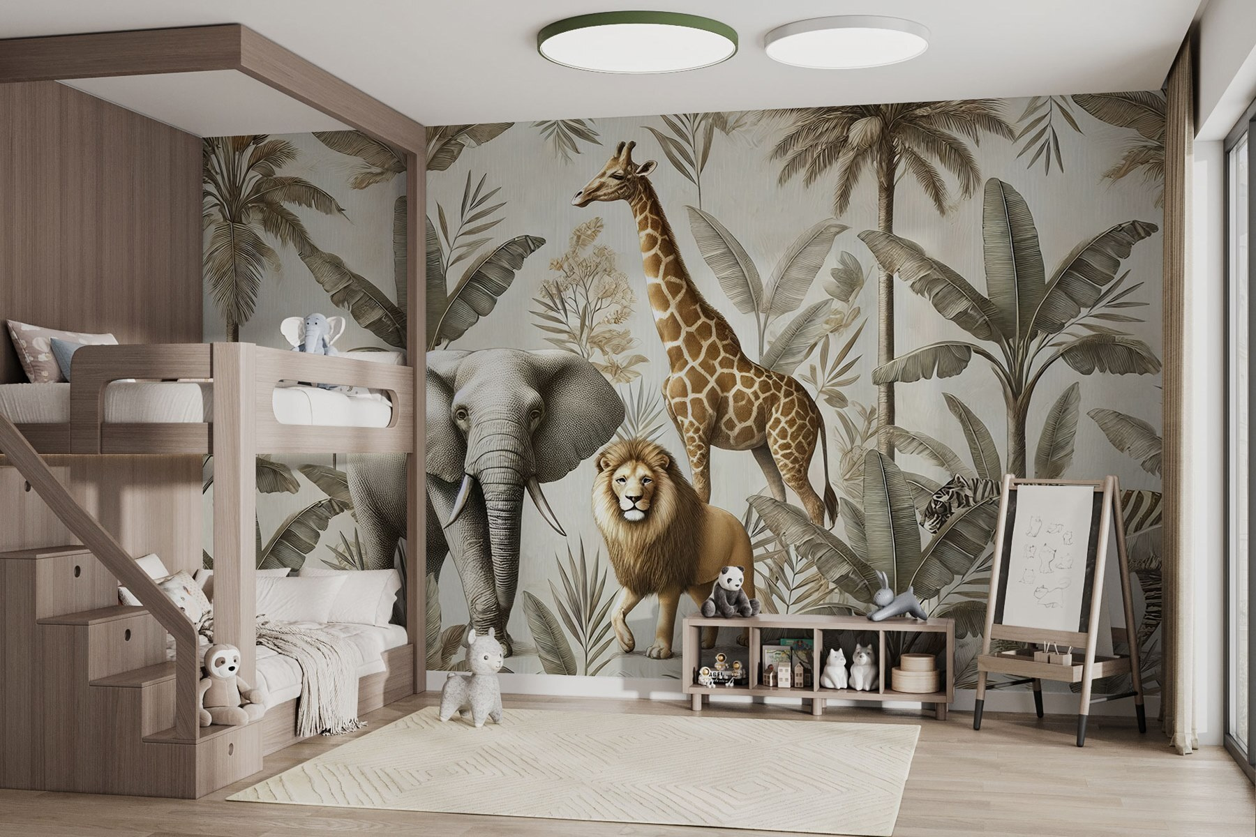 Przekształć swoją przestrzeń w egzotyczną ucieczkę dzięki tej oszałamiającej fototapecie ściennej przedstawiającej tętniącą życiem scenę z dżungli. Wyobraź sobie odważnego słonia, królewską żyrafę i majestatycznego lwa, a wszystko to w otoczeniu bujnych roślin i palm – jak jakikolwiek pokój mógłby nie czuć się bardziej ryzykowny? To jak przeniesienie kawałka dzikiej przyrody do swojego domu. Rodzina i przyjaciele będą uwielbiać rozmawiać o zaciekłym tygrysie czającym się wśród zieleni, popijając kawę. Ponadto ciepłe, ziemiste odcienie tworzą uspokajającą atmosferę, idealną do relaksu lub czerpania inspiracji. Ta fototapeta to nie tylko dekoracja; to mała przygoda, która czeka, aby się wydarzyć!