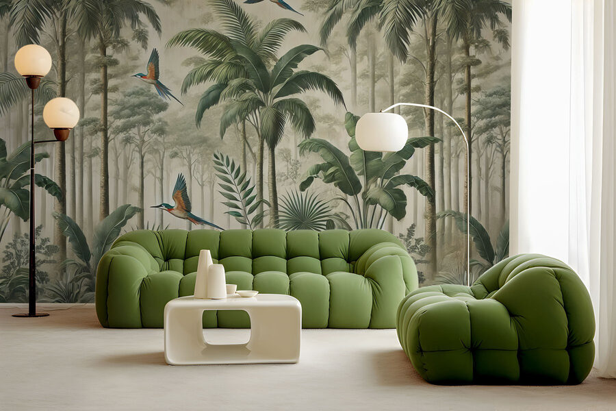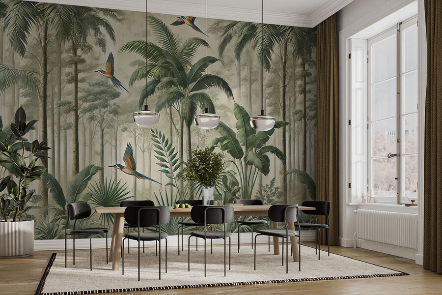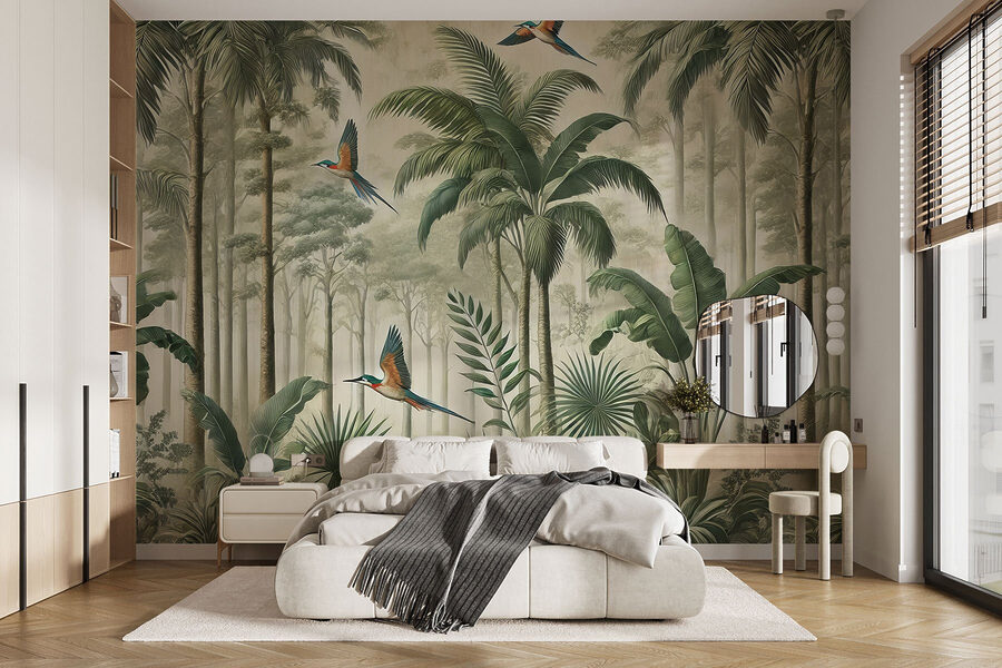 Przekształć dowolny pokój w spokojną ucieczkę dzięki tej oszałamiającej fototapecie przedstawiającej ptaki szybujące nad bujnym lasem. Wyobraź sobie, że wchodzisz do środka i czujesz się jak w spokojnej dżungli, gdzie żywe kolory wyskakują, a powietrze jest bogate w zapach tropikalnych liści. Zabawny lot ptaków dodaje odrobinę kaprysu, rozjaśniając nawet najnudniejsze przestrzenie. Idealna do stworzenia przytulnego kącika do czytania lub spokojnego odosobnienia, ta fototapeta szepcze cicho o przygodzie i spokoju. Idealna dla każdego, kto kocha naturę lub po prostu potrzebuje małej ucieczki od codziennego zgiełku – bo kto nie chce poczuć się jak na tropikalnej wycieczce? Więc pozwól swoim ścianom śpiewać i podnieś swoją przestrzeń!
