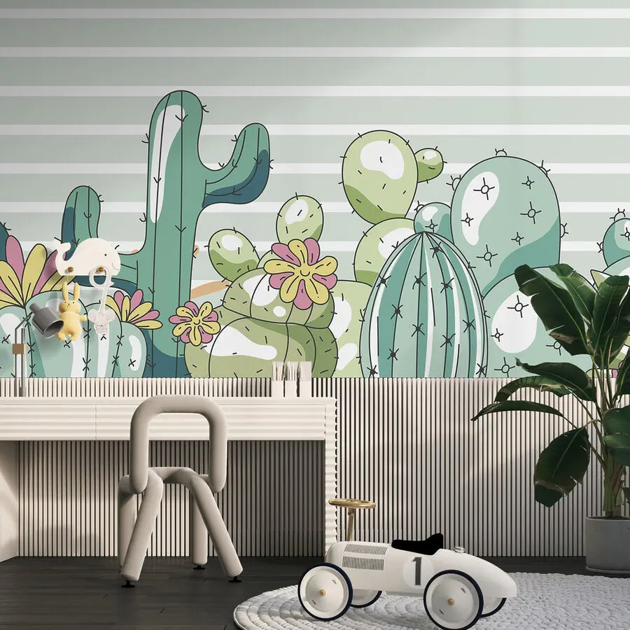 Przekształć dowolny pokój w zabawną oazę dzięki tej zachwycającej fototapecie przedstawiającej żywą grupę kaktusów ozdobionych wesołymi kwiatami. Wyobraź sobie, że wkraczasz do przestrzeni, w której te dziwaczne rośliny wprowadzają poczucie ciepła i zabawy, jakbyś miał mini pustynną imprezę bezpośrednio na ścianie. Miękkie, uspokajające paski w tle delikatnie równoważą żywe kolory kaktusów, dzięki czemu idealnie nadają się do pokoju dziecięcego lub przytulnego kącika do czytania. To jak mały sekret natury, zachęcający do uśmiechu i pobudzający wyobraźnię. Wyobraź sobie dzieci zwijające się w kłębek z książką pod tą czarującą fototapetą lub marzące o kolejnej przygodzie w magicznym ogrodzie.