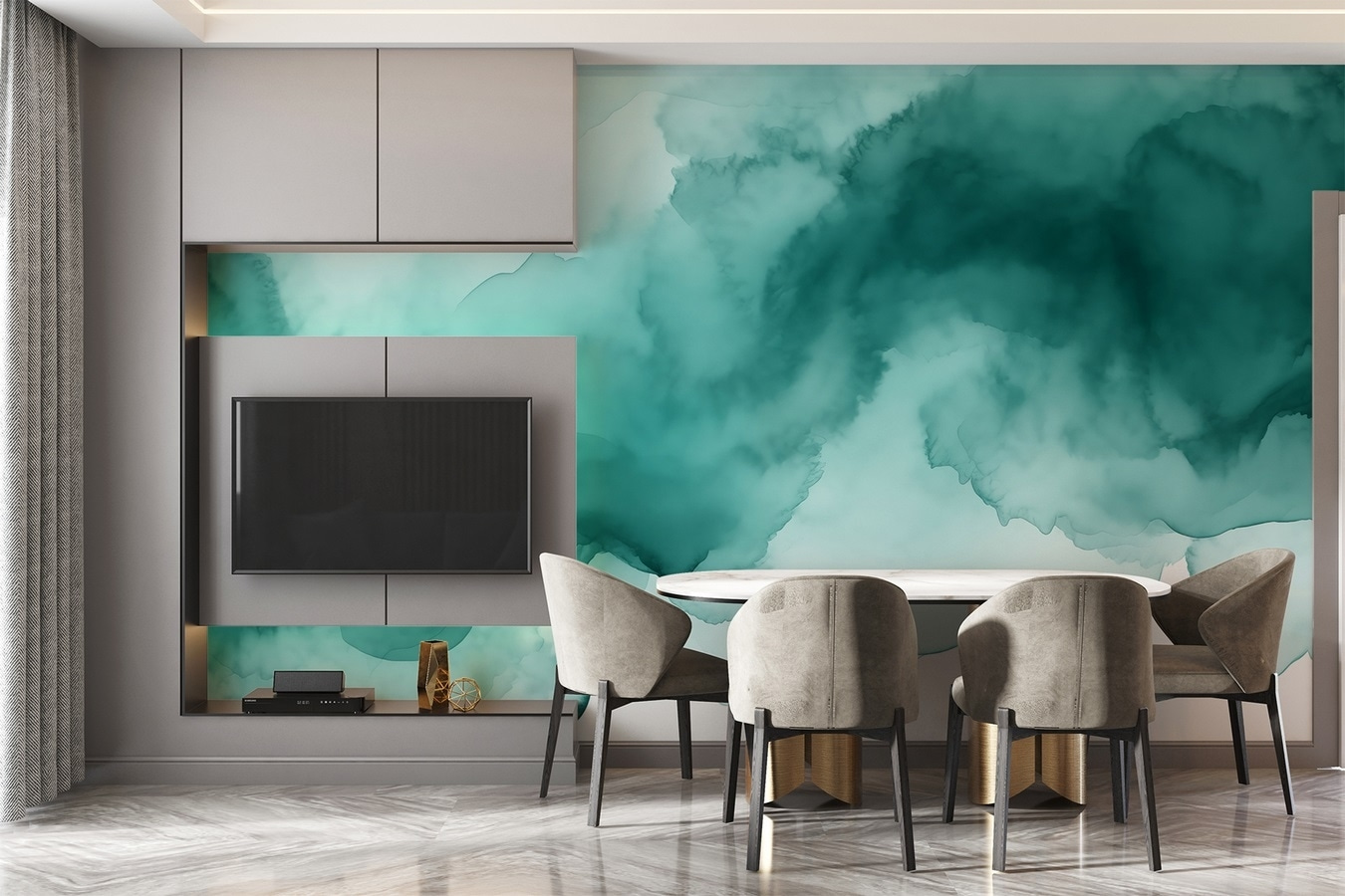 Przekształć swoją przestrzeń za pomocą fototapety ściennej “Flowing Shades of Tranquil Teal Hues”, która przypomina zanurzenie się w spokojnym oceanie. Wyobraź sobie, że każdego ranka budzisz się w tych kojących błękitach – to jak mini wakacje bezpośrednio na ścianie. Miękkie, akwarelowe wiry przynoszą poczucie spokoju, idealne do przytulnego kącika do czytania lub tętniącego życiem salonu. Wyobraź sobie, jak popijasz kawę, wpatrując się w tę fototapetę, podczas gdy twoje zmartwienia odpływają jak chmury. To nie tylko dekoracja; to doświadczenie, nastrój, delikatne przypomnienie o oddychaniu i relaksie. Kto by pomyślał, że spokój może wyglądać tak pięknie?
