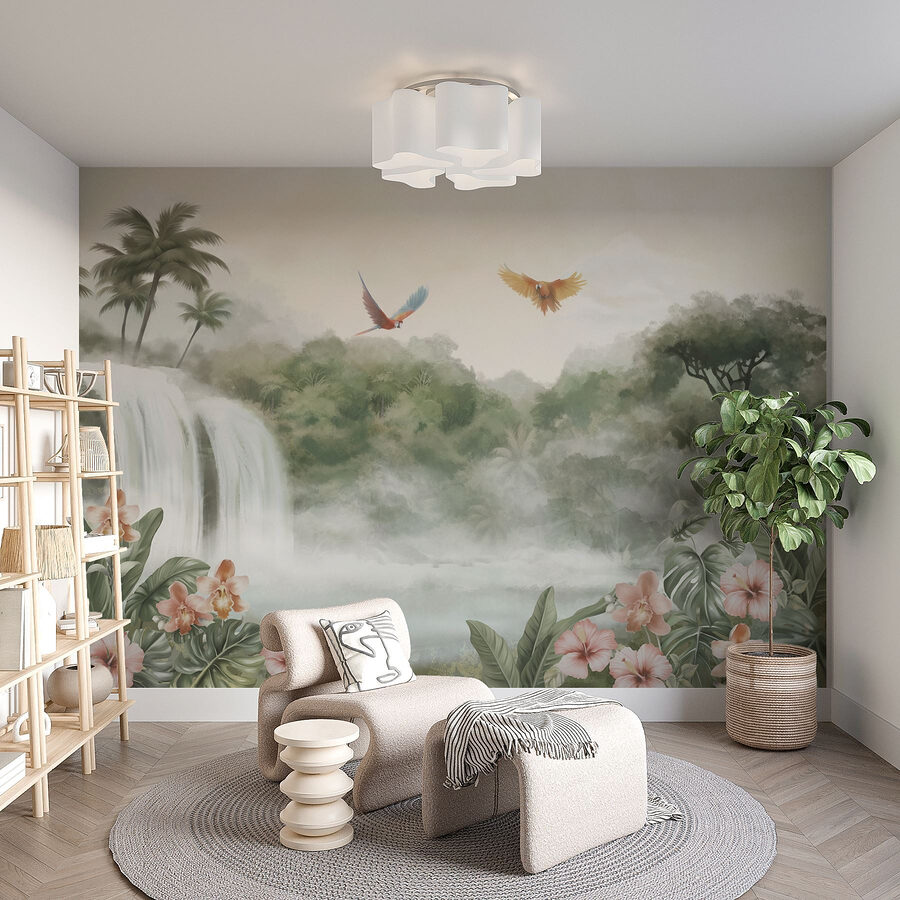 Przekształć dowolną przestrzeń w spokojny tropikalny raj dzięki tej oszałamiającej fototapecie z wodospadem przedstawiającej żywe ptaki unoszące się nad bujną zielenią. Wyobraź sobie, że każdego dnia wchodzisz do spokojnej oazy, a delikatny dźwięk kaskadowej wody wypełnia twój umysł. Delikatne różowe kwiaty przebijają się przez liście, dodając odrobinę koloru, który jest idealny do rozjaśnienia przytulnego kącika lub odważnego wyrazu na ścianie. To jak przeniesienie kawałka natury do wnętrza – nie wymaga butów turystycznych! Idealna dla miłośników przyrody, ta fototapeta zachęca do zatrzymania się, oddechu i cieszenia się odrobiną spokoju w domu. Co więcej, może inspirować do marzeń o tropikalnych wakacjach, nawet jeśli na zewnątrz jest chłodne popołudnie. Ciesz się pięknem i pozwól swoim ścianom opowiedzieć historię!