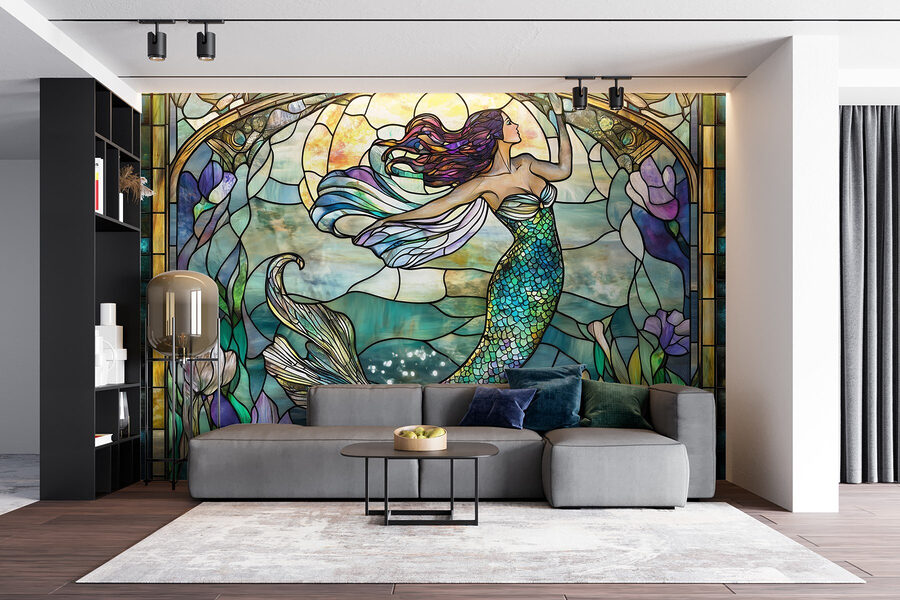 Zanurz się w kolorowym podwodnym świecie dzięki tej fototapecie ściennej z oszałamiającym witrażem przedstawiającym syrenę. Wyobraź sobie, że popijasz poranną kawę, rozkoszując się radosnymi odcieniami błękitu i zieleni oceanu rozlewającymi się po ścianach. Delikatne wiry i płynne linie tworzą poczucie spokoju, które łagodzi każdą przestrzeń. Wyobraź sobie przytulne wieczory filmowe z przyjaciółmi, podczas których wszystkich przyciąga magiczny urok syreny. Ta fototapeta nie tylko udekoruje pokój, ale zaprosi do codziennego życia historie, marzenia i odrobinę kaprysu. Idealna dla miłośników natury lub każdego, kto chce wprowadzić odrobinę morza do swojego domu.