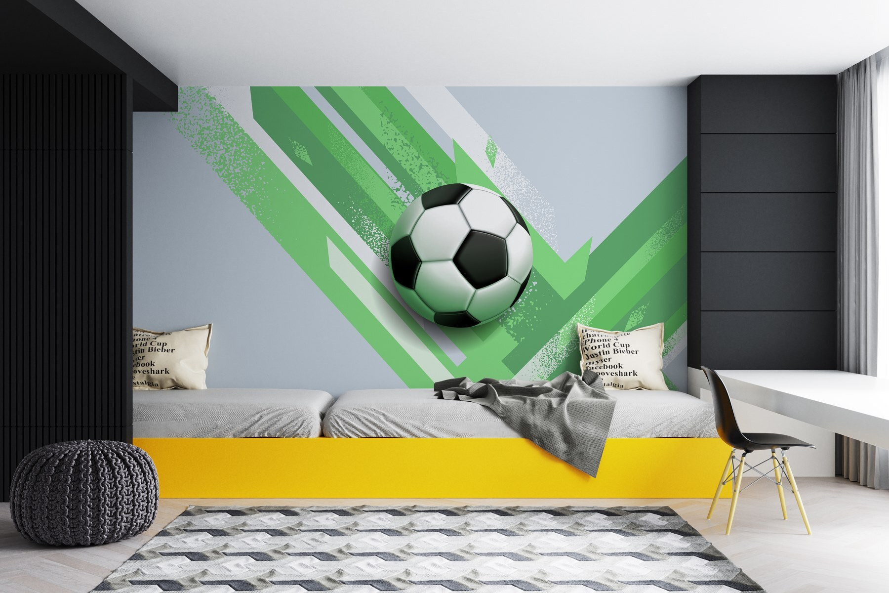 Przekształć zwykłą ścianę w tętniące życiem święto piłki nożnej dzięki tej fototapecie “Piłka nożna na zielono-białym tle”. To nie tylko element wystroju; to zaproszenie do marzeń o epickich meczach, golach w ostatniej minucie i słodkim dźwięku piłki uderzającej w tył siatki. Wyobraź sobie dzieci bawiące się w salonie lub przyjaciół spotykających się na wieczornych meczach – ta fototapeta stanowi idealne tło. Świeża zieleń wprowadza żywy nastrój, dzięki czemu każda przestrzeń wydaje się bardziej energiczna. Niezależnie od tego, czy jesteś zagorzałym fanem, czy po prostu cenisz sobie odrobinę sportowego stylu, ta fototapeta doda idealnego akcentu do zabawy. Co więcej, może nawet zainspirować do przyjacielskiej gry na własnym podwórku!