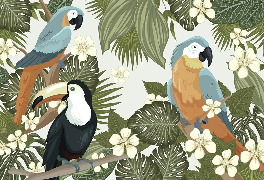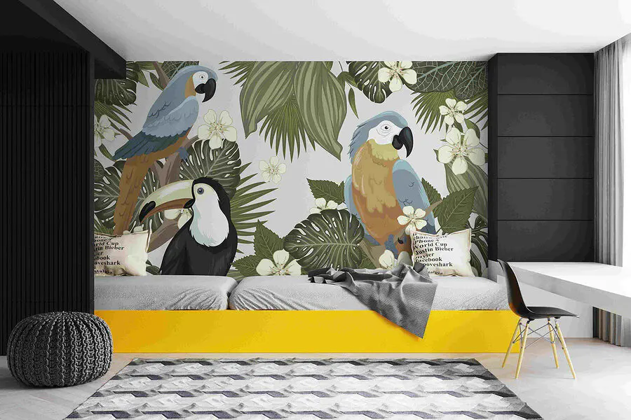 Odmień swoją przestrzeń dzięki tej tętniącej życiem fototapecie, przedstawiającej ptaki siedzące na gałęzi drzewa, doskonale osadzone wśród bujnych liści i delikatnych kwiatów. To nie tylko dekoracja ścienna; to zaproszenie odrobiny natury wprost do twojego domu. Wyobraź sobie, że popijasz poranną kawę, podczas gdy te kolorowe stworzenia zdają się rozmawiać – mowa o żywej atmosferze! Niezależnie od tego, czy jest to przytulny salon, czy wesoły pokój dziecięcy, ta fototapeta dodaje ciepła i odrobinę tropikalnych wibracji. Kto nie chciałby poczuć delikatnego kołysania bryzy dżungli za każdym razem, gdy przechodzi obok? Idealna dla miłośników ptaków lub każdego, kto potrzebuje odrobiny kaprysu!