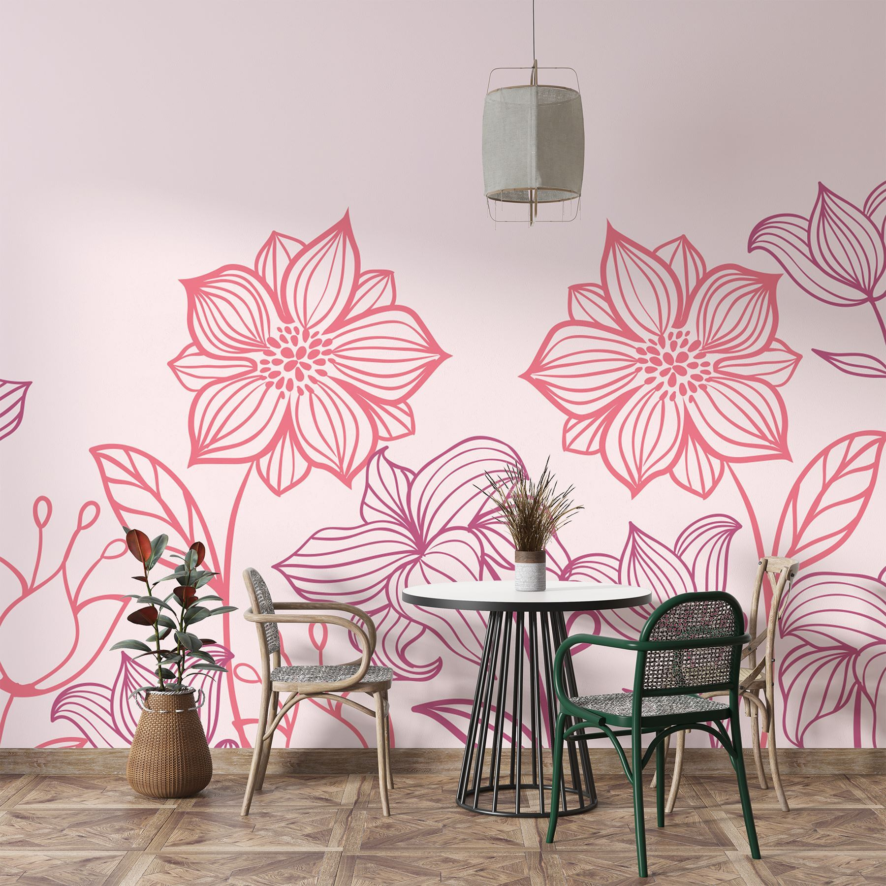 Przekształć każdą przestrzeń w przytulny azyl dzięki tej oszałamiającej fototapecie ściennej “Linia kwiatów z liśćmi”. Wyobraź sobie, że budzisz się na tle delikatnego różu ozdobionego delikatnie naszkicowanymi kwiatami, wprowadzając naturę do swojego domu. To tak, jakby mieć słonecznik jako porannego kumpla – zawsze jasny i wesoły. Idealna do salonu lub spokojnego kącika do czytania, ta fototapeta szepcze relaks i kreatywność. Co więcej, nie ma tu potrzeby posiadania zielonego kciuka – te kwiaty nie więdną ani nie wymagają podlewania. Po prostu usiądź wygodnie, rozkoszuj się pięknem i pozwól kwiatowym wibracjom podnieść poziom twojego wystroju!