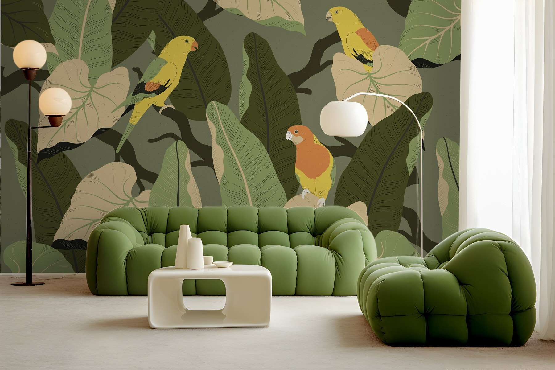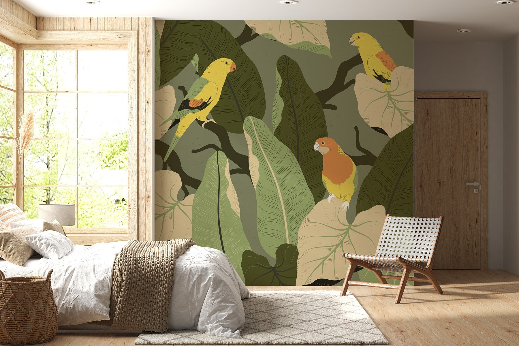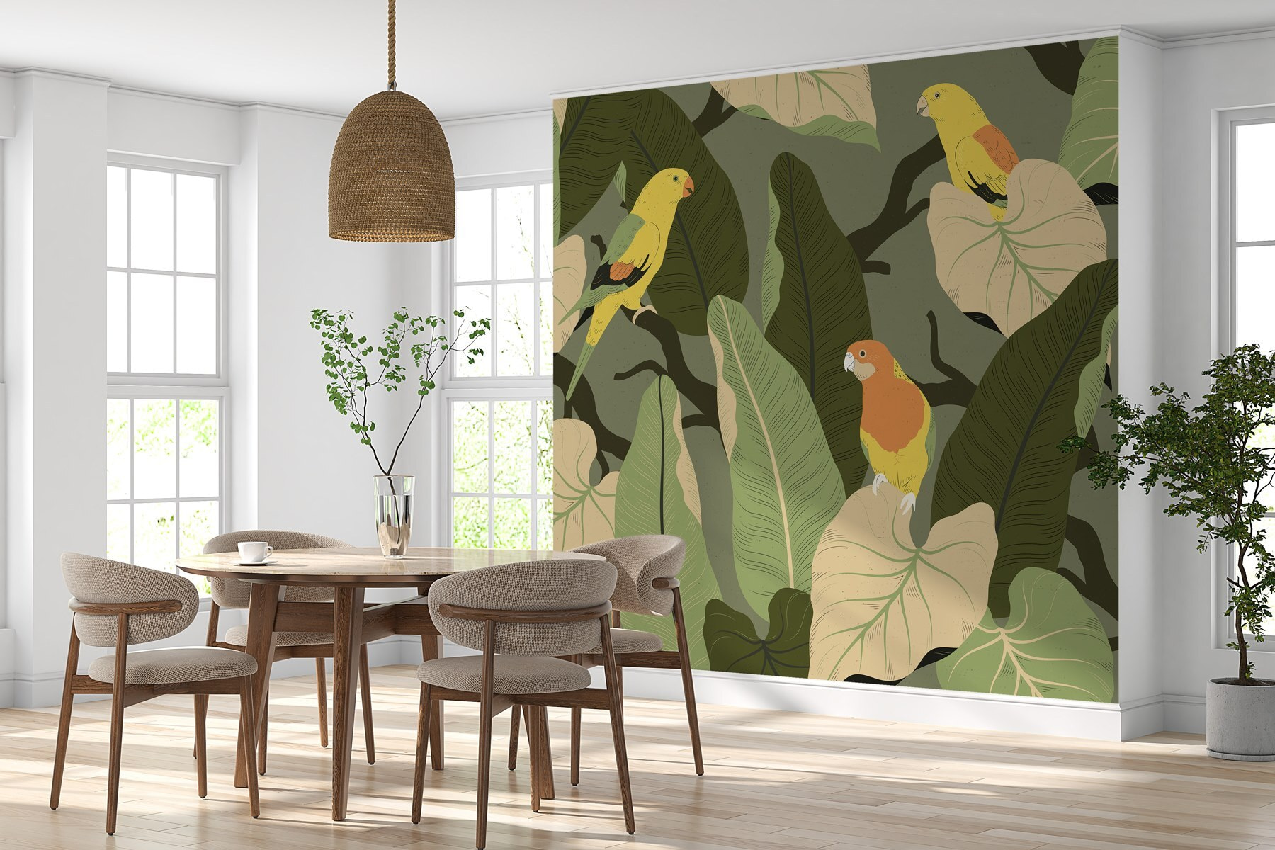 Przekształć dowolną przestrzeń w bujny raj dzięki tej żywej fototapecie z kolorowymi ptakami siedzącymi na liściastych gałęziach! Wyobraź sobie, że wchodzisz do pokoju, w którym tropikalne wibracje płyną jak delikatna bryza. Ci weseli pierzaści przyjaciele wydają się śpiewać, zapraszając do zatrzymania się i chłonięcia otaczającego ich piękna. Idealna do kącika do czytania lub tętniącej życiem jadalni, ta fototapeta wnosi odrobinę natury do wnętrza – bez potrzeby posiadania zielonego kciuka! Co więcej, jest to dobry początek rozmowy, pobudzający do opowieści o podróżach do egzotycznych miejsc. Kto nie chciałby obudzić się otoczony takim urokiem? To jak mini-wakacje w domu!