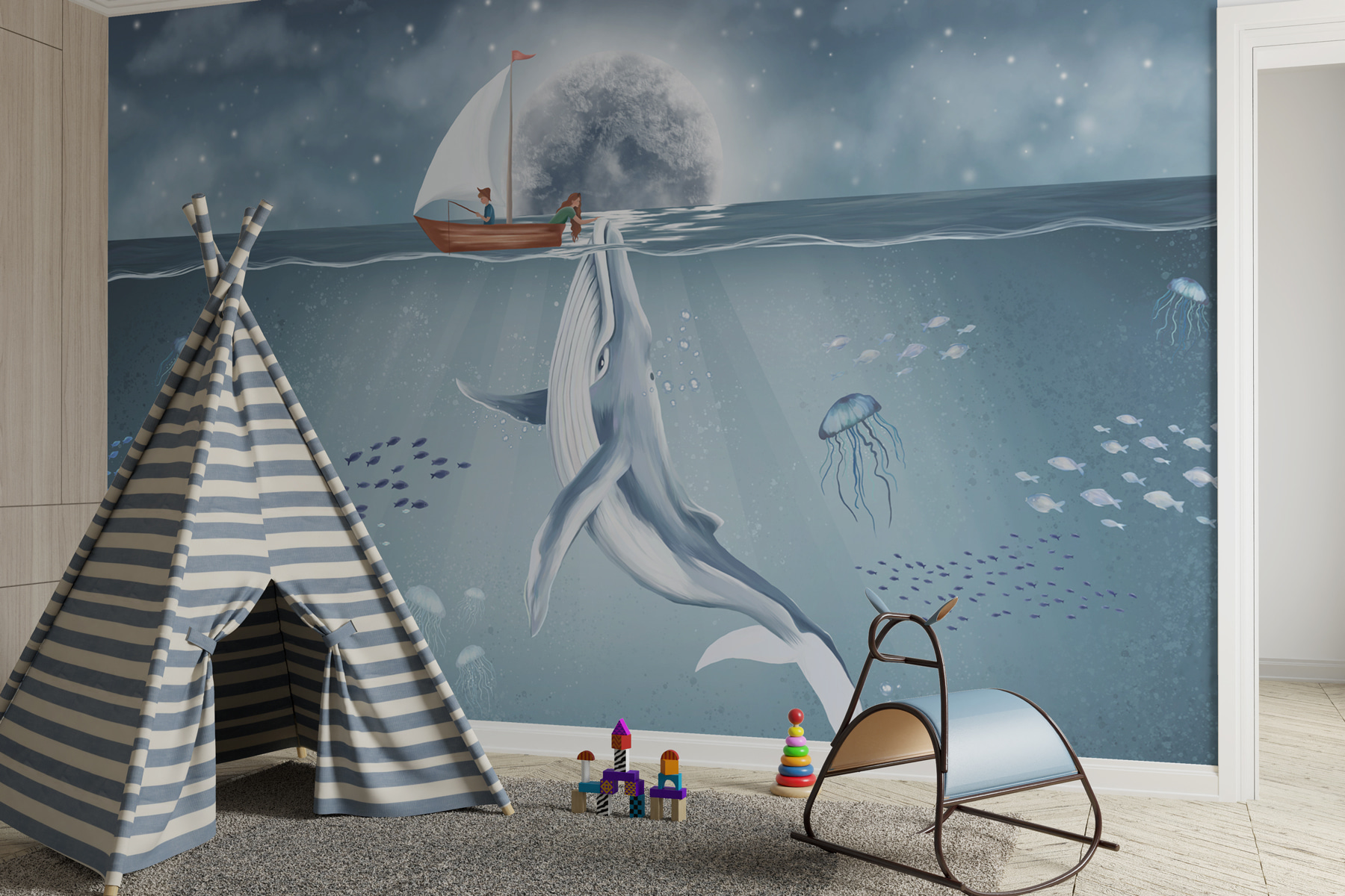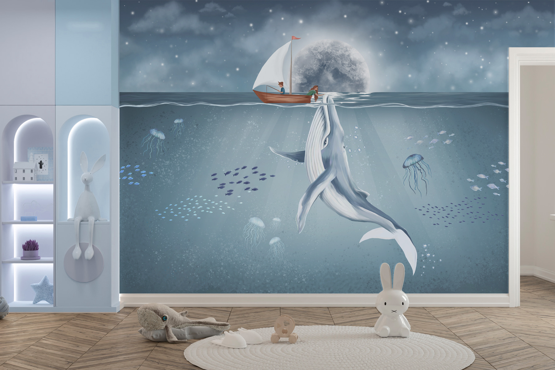 Zanurz się w świecie cudów z fototapetą ścienną “Wieloryb pływający w wodzie”. Ta fototapeta przekształca każdą nudną ścianę w spokojną podwodną scenę, w której majestatyczny wieloryb płynie z gracją pod falami. Wyobraź sobie: siedzisz w swoim salonie, popijając herbatę, a przed tobą roztacza się spokojne piękno oceanu. Miękkie błękity i delikatne biele tworzą uspokajającą atmosferę, idealną do relaksu po długim dniu. Ponadto pobudza do rozmów – każdy uwielbia dobre historie o wielorybach! Wyobraź sobie, że przyjaciele wędrują, otwierając oczy na tę spokojną oceaniczną ucieczkę. Idealny do pokoju dziecięcego lub przytulnego kącika do czytania, to jak przyniesienie kawałka morza do domu. Ujmij piękno natury i zrób plusk w swoim wystroju!