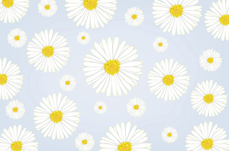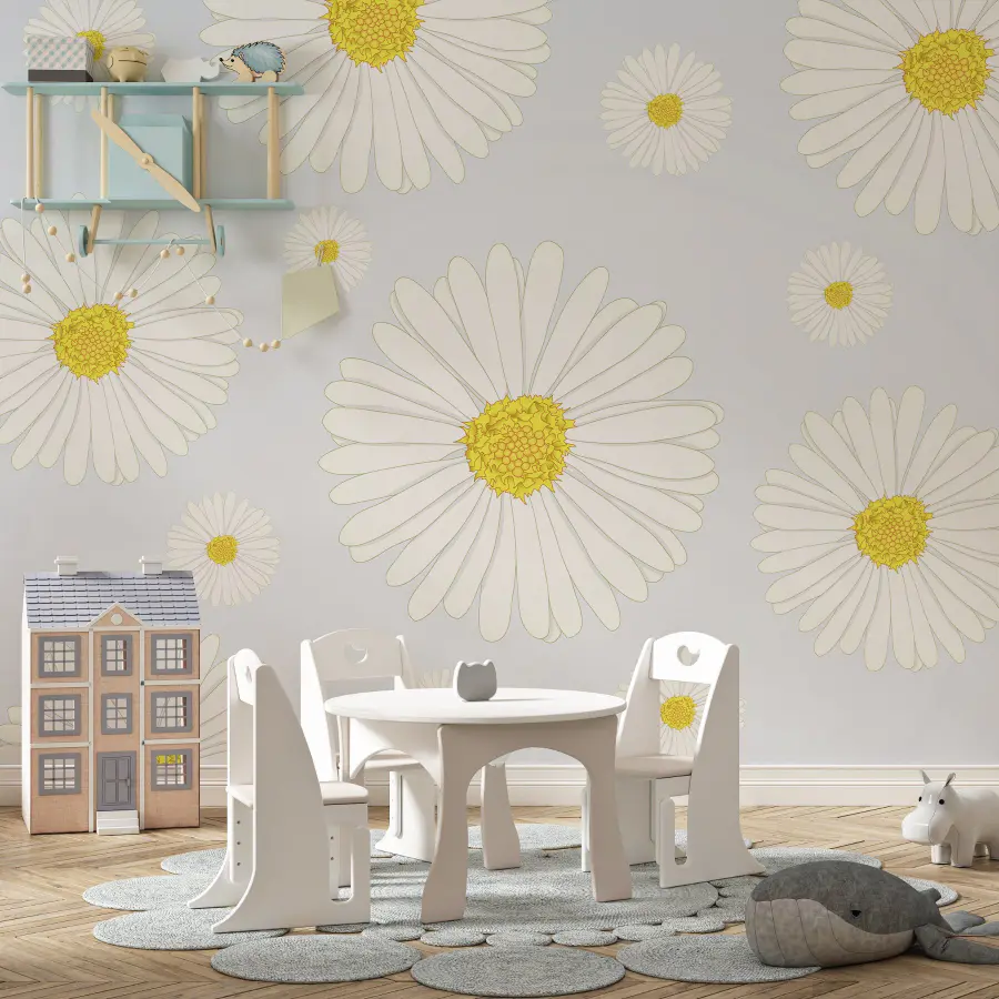 Rozjaśnij swoją przestrzeń dzięki tej wesołej fototapecie ściennej z zabawną grupą białych i żółtych kwiatów. Wyobraź sobie, że budzisz się z taką dawką kwiatowej energii – to jak słoneczny dzień we własnym pokoju, bez pyłków! Delikatne niebieskie tło sprawia, że te kwiaty są wyskakujące, tworząc orzeźwiającą atmosferę, która jest idealna do każdego zakątka domu.