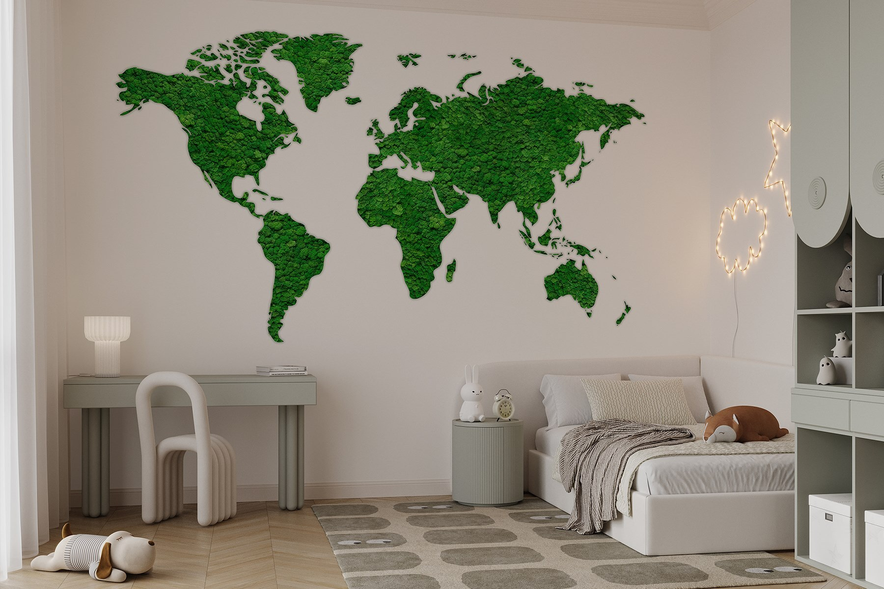 Odmień swoją przestrzeń dzięki tej oszałamiającej fototapecie ściennej przedstawiającej mapę świata wykonaną w całości z bujnych zielonych roślin. To jak przeniesienie kawałka natury do wnętrza – nie wymaga podlewania! Wyobraź sobie, że przytulasz się w pokoju, w którym kontynenty są wykonane z żywej zieleni. Wzbudza to ciekawość i rozmowy, idealne na te chwile “gdzie jest to miejsce?”. Dodatkowo, daje to uspokajającą atmosferę, jak głęboki oddech świeżego powietrza. Czy to w salonie, czy w biurze, ta fototapeta z pewnością zainspiruje do wędrówek. Kto wiedział, że wystrój może być tak odważny?