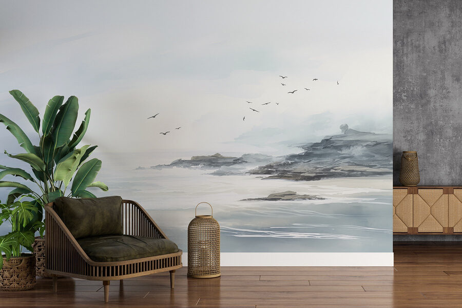 Odmień każde pomieszczenie dzięki tej czarującej fototapecie “Ptaki latające nad skalistą plażą”. Wyobraź sobie, że budzisz się w delikatnych odcieniach oceanu i tych rozmarzonych ptaków żeglujących po niebie. To jak mini-wakacje bezpośrednio na ścianie! Delikatne kolory tworzą kojącą atmosferę, idealną do chłodnego salonu lub spokojnej sypialni.