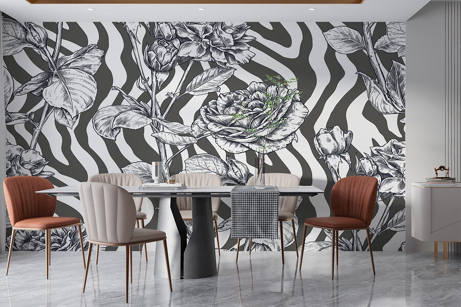 Przekształć swoje ściany w oszałamiającą wizualną ucztę dzięki tej czarno-białej fototapecie z różami. To jak posiadanie ogrodu, który nigdy nie więdnie, bez konewki i okazjonalnych robaków. Delikatne kwiaty tańczą na eleganckim, pasiastym tle, dodając odrobinę krawędzi bez popadania w przesadę. Wyobraź sobie, że popijasz poranną kawę lub zwijasz się z książką, otoczony tym eleganckim kwiatowym pięknem. Niezależnie od tego, czy jest to przytulny salon, czy stylowe biuro, ta fototapeta wnosi odrobinę uroku natury z nowoczesnym akcentem. Idealna dla każdego, kto pragnie odrobiny osobowości – nie wymaga zielonych kciuków!