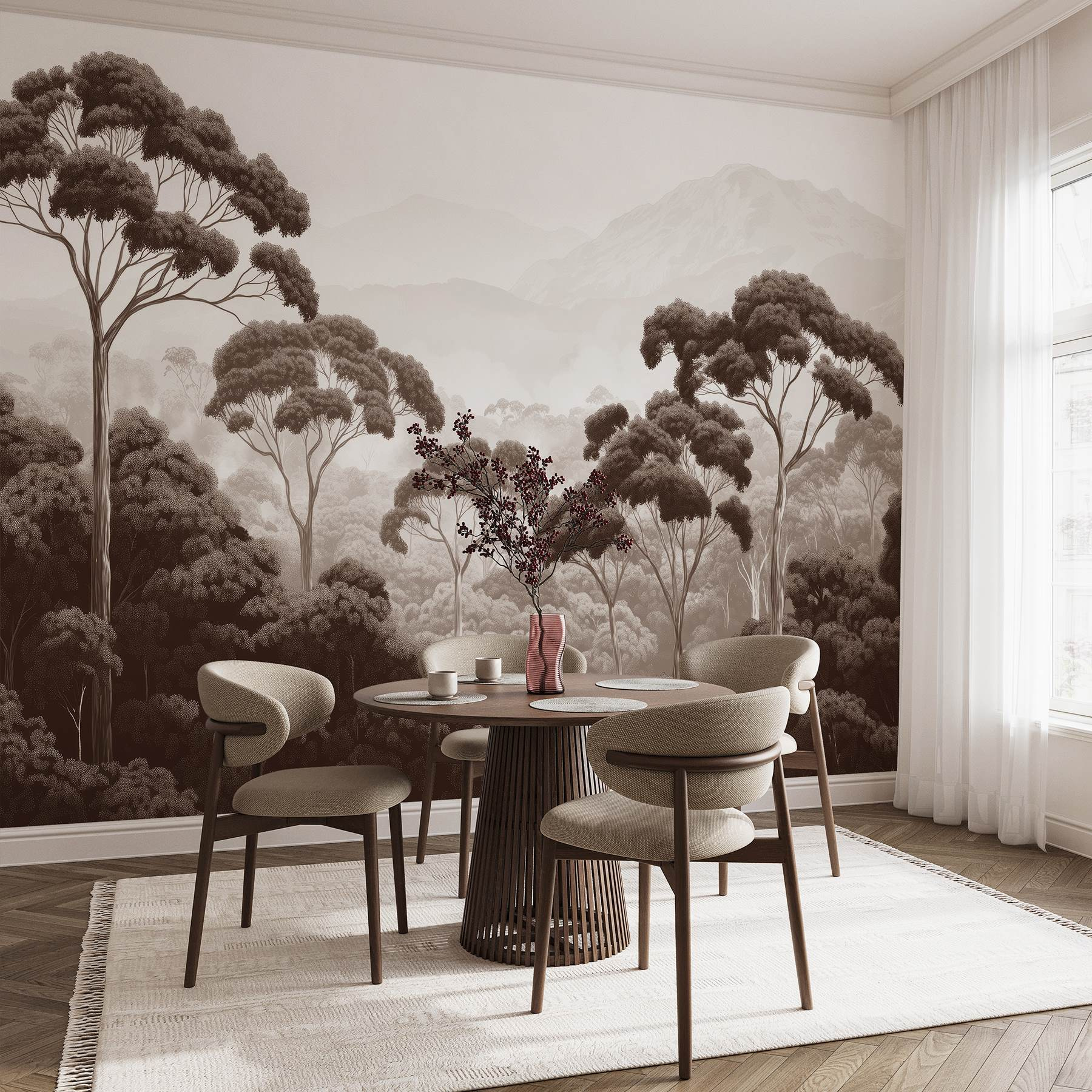 Przekształć dowolny pokój w spokojną ucieczkę dzięki tej oszałamiającej fototapecie ściennej przedstawiającej spokojną leśną scenerię – z wysokimi drzewami i majestatycznymi górami w tle. Wyobraź sobie, że każdego dnia budzisz się z tym uspokajającym widokiem, jakby sama natura przeniosła się do twojego domu. Miękkie, ziemiste odcienie wywołują poczucie spokoju, idealne do wylegiwania się, a nawet dodawania przytulnej atmosfery podczas maratonów Netflix. To jak przeniesienie odrobiny wspaniałej przyrody do wnętrza, bez owadów i zabłoconych butów. Masz ochotę na odrobinę marzeń? Oprzyj się wygodnie i pozwól oczom wędrować po tym sennym krajobrazie. Idealna do każdej przestrzeni, ta fototapeta sprawi, że każda ściana poczuje się jak miejsce ucieczki.
