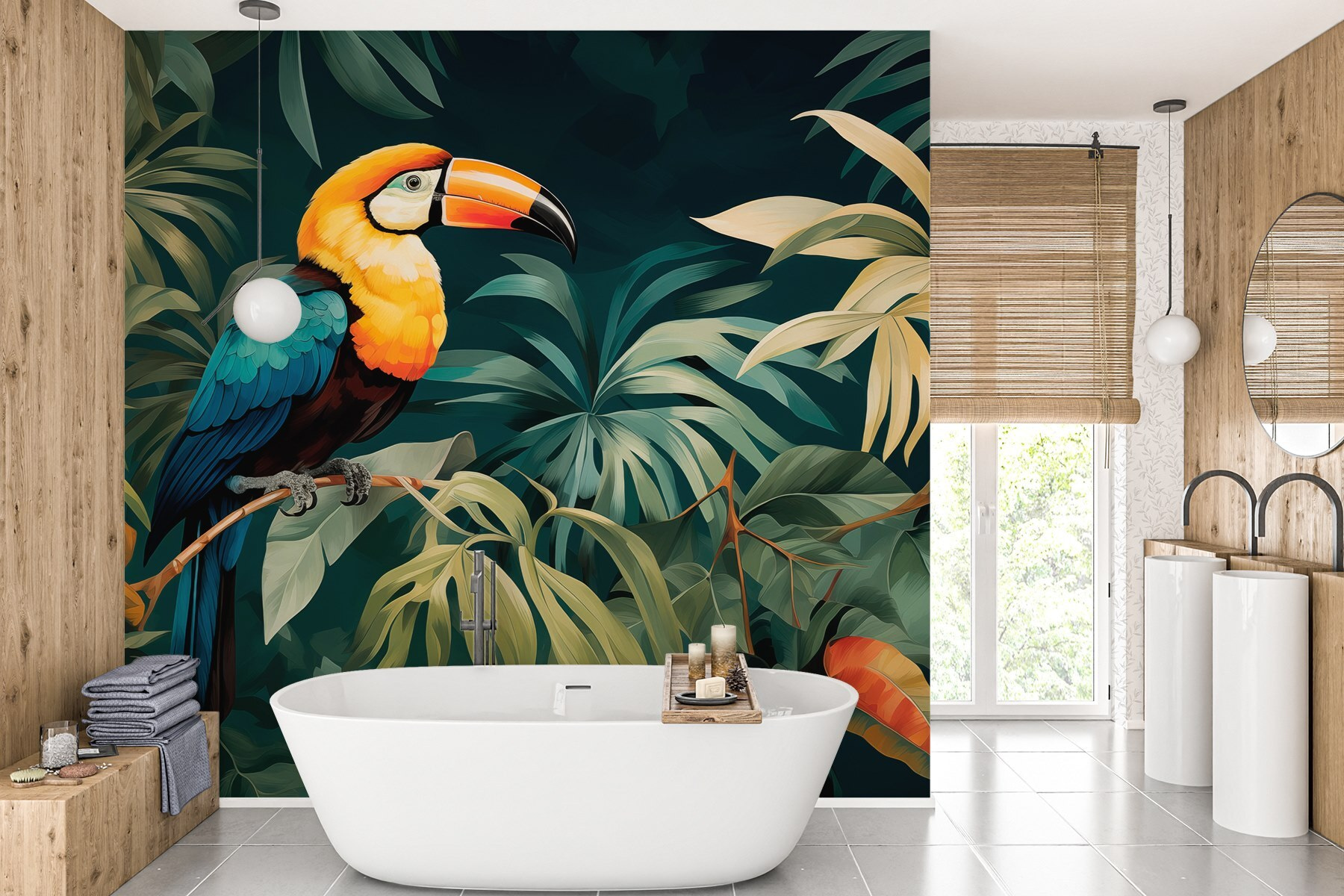 Odmień swoją przestrzeń z odrobiną uroku natury! Ta fototapeta ścienna, przedstawiająca żywego ptaka siedzącego na gałęzi, zaprasza odrobinę dżungli prosto do twojego domu. Wyobraź sobie, jak rozjaśnia pokój, wypełniając go uczuciem przygody i spokoju. To jak posiadanie małego kawałka raju na ścianie!