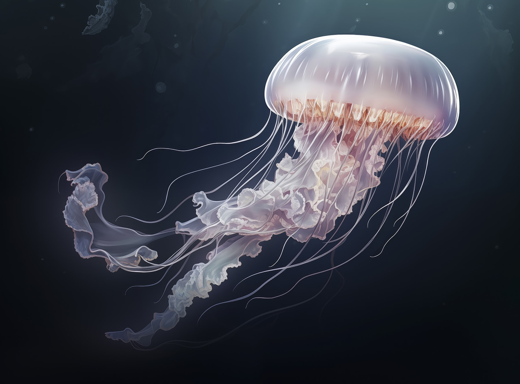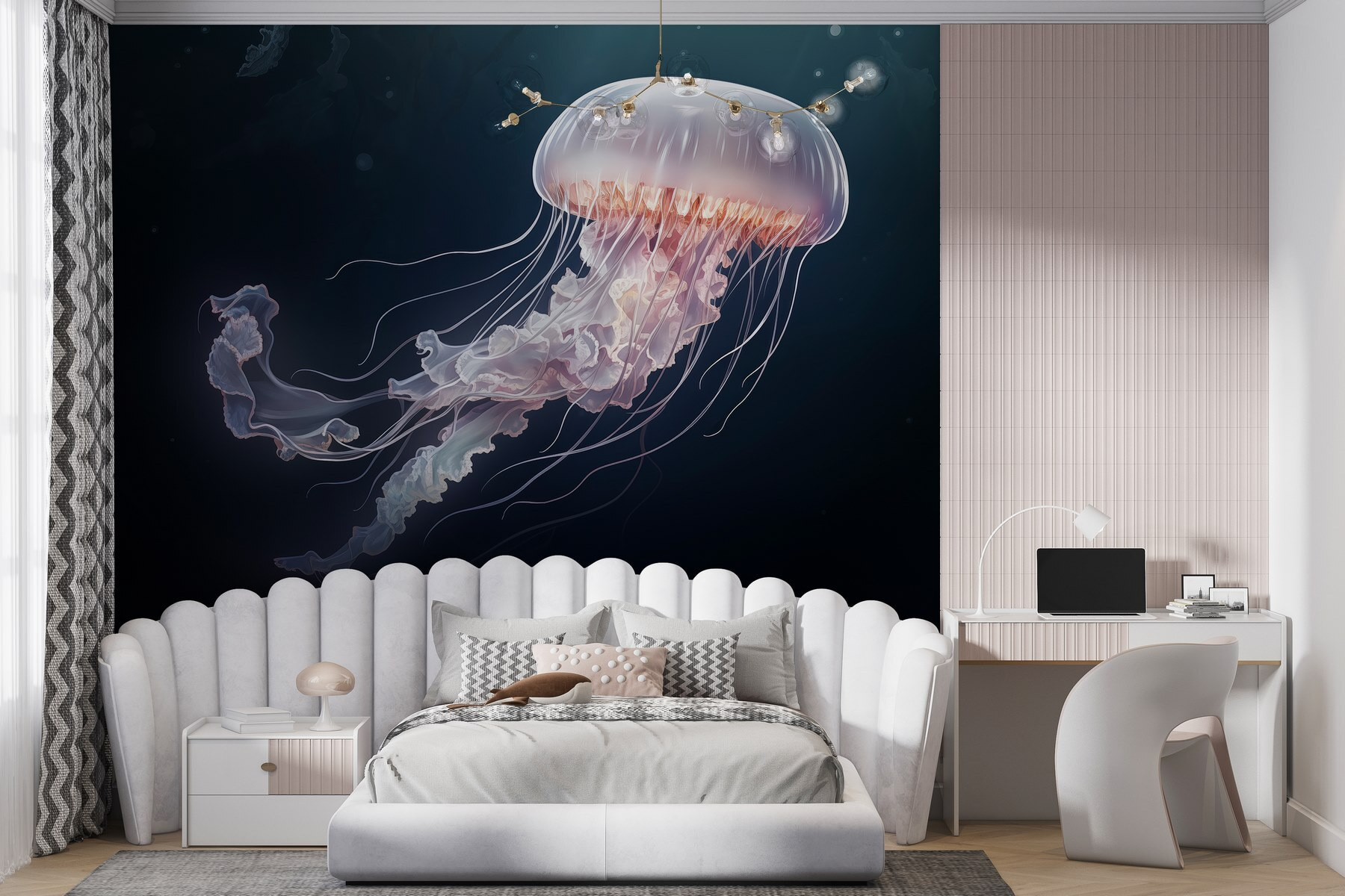 Zanurz się w morzu spokoju dzięki tej oszałamiającej fototapecie z meduzami. Wyobraź sobie, że wisi w przytulnym kąciku lub salonie, rzucając kojącą atmosferę, która przypomina wszystkim o leniwych dniach na plaży. Kolory przepływają jak fale oceanu, subtelnie oddając to senne, podwodne uczucie. Wyobraź sobie, że przyjaciele zatrzymują się w miejscu z szeroko otwartymi oczami, podziwiając jej delikatny wdzięk. Ta fototapeta nie tylko zdobi ścianę; przenosi cię do spokojnego podwodnego świata. To tak, jakby mieć kawałek oceanu w domu – idealny do marzeń na jawie lub planowania następnego wypadu nad morze. Kto by pomyślał, że ocean może wyglądać tak dobrze?