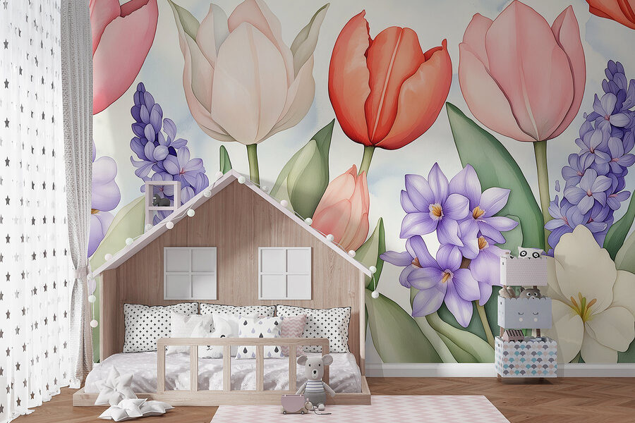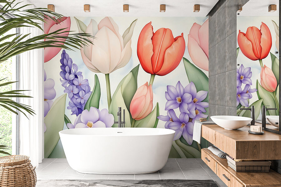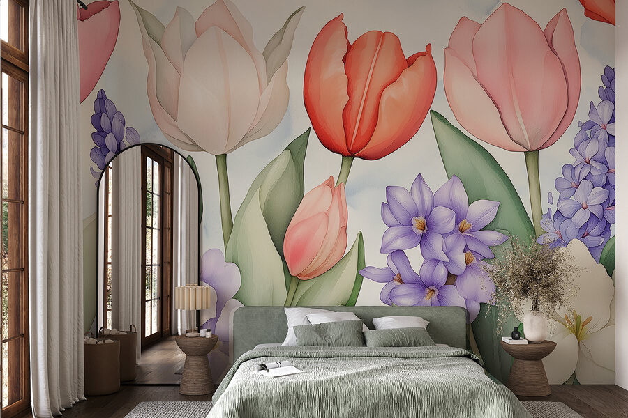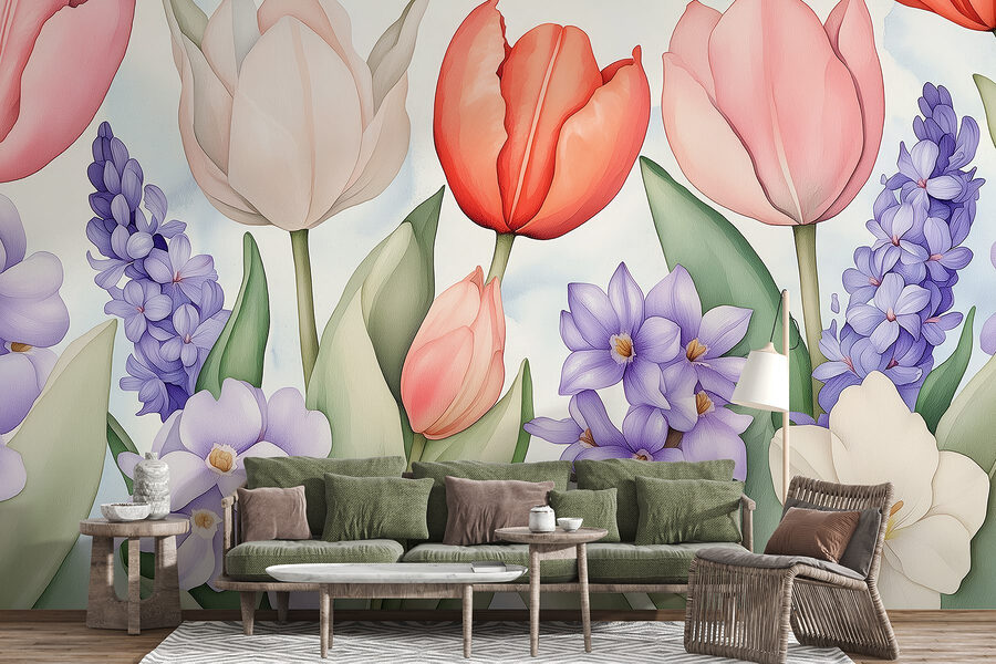 Wyobraź sobie, że wchodzisz do pokoju, w którym przez cały rok czujesz wiosnę. Ta czarująca fototapeta, pełna żywych kwiatów i bujnych liści, właśnie to robi! Dzięki oszałamiającemu wachlarzowi tulipanów i delikatnych kwiatów, to tak, jakby mieć mini ogród bezpośrednio na ścianie. Delikatne kolory wprowadzają poczucie spokoju, dzięki czemu idealnie nadaje się do przytulnego kącika do czytania lub tętniącego życiem salonu. Goście poczują tę ciepłą, rozmytą atmosferę, a może nawet wyruszą na poszukiwanie najbliższej kwiaciarni! I hej, to świetny sposób na zaimponowanie znajomym bez konieczności podlewania czegokolwiek. Niezależnie od tego, czy jesteś fanatykiem kwiatów, czy po prostu kochasz odrobinę koloru, ta fototapeta jest dla ciebie!