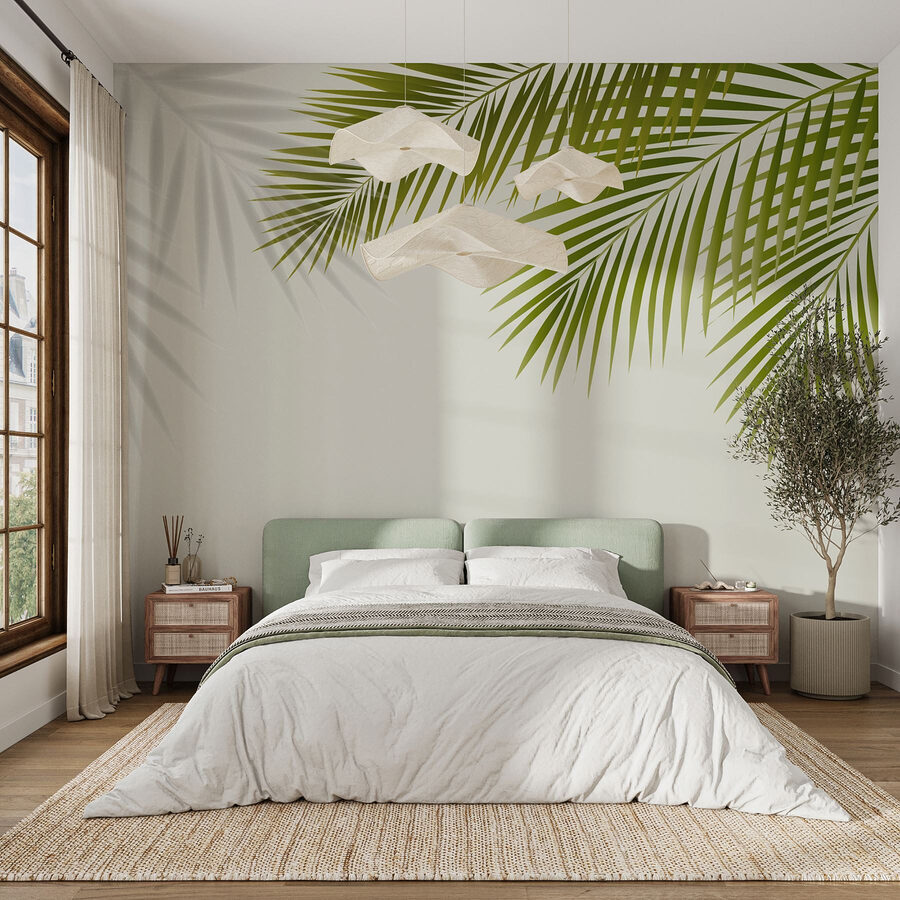 Przekształć każde pomieszczenie w odświeżającą ucieczkę dzięki tej fototapecie z bujnymi zielonymi liśćmi na delikatnym białym tle. To jak natychmiastowa ucieczka, idealna dla tych, którzy pragną kawałka natury bez kłopotów z podlewaniem roślin. Wyobraź sobie, że budzisz się w tej tętniącej życiem scenerii – to tak, jakbyś miał tropikalną oazę bezpośrednio na ścianie. Niezależnie od tego, czy jest to przytulny salon, czy przewiewna sypialnia, te liście machają na powitanie, jakby zapraszając do odpoczynku i relaksu. Idealna dla miłośników natury, ta fototapeta dodaje spokojnej atmosfery, jednocześnie wnosząc odrobinę życia. Idealna do kącika wypoczynkowego lub na ścianę, to łatwy sposób na tchnięcie świeżego powietrza w wystrój, bez konieczności posiadania palm.