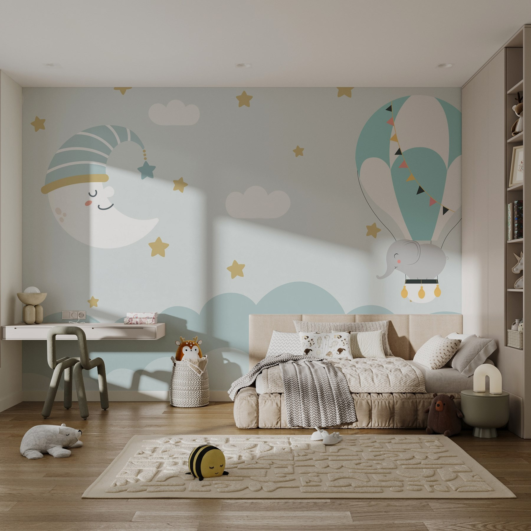 Przekształć dowolny pokój w senną ucieczkę dzięki uroczej fototapecie “Cartoon Elephant and Moon”. Wyobraź to sobie: kapryśny słoń dryfujący leniwie w balonie na ogrzane powietrze, wysoko nad puszystymi chmurami i migoczącymi gwiazdami. To jak bajka na dobranoc, która ożyła! Ta fototapeta dodaje odrobinę magii, dzięki czemu jest idealna dla dzieci lub każdego, kto jest młody duchem. Wyobraź sobie przytulne wieczory, podczas których ta zachwycająca scena wywołuje chichot i marzenia. Delikatne kolory wprowadzają spokojne wibracje, zamieniając zwykłą ścianę w zabawną krainę czarów. Kto nie chciałby unosić się po nocnym niebie z własnym słoniowym przyjacielem?