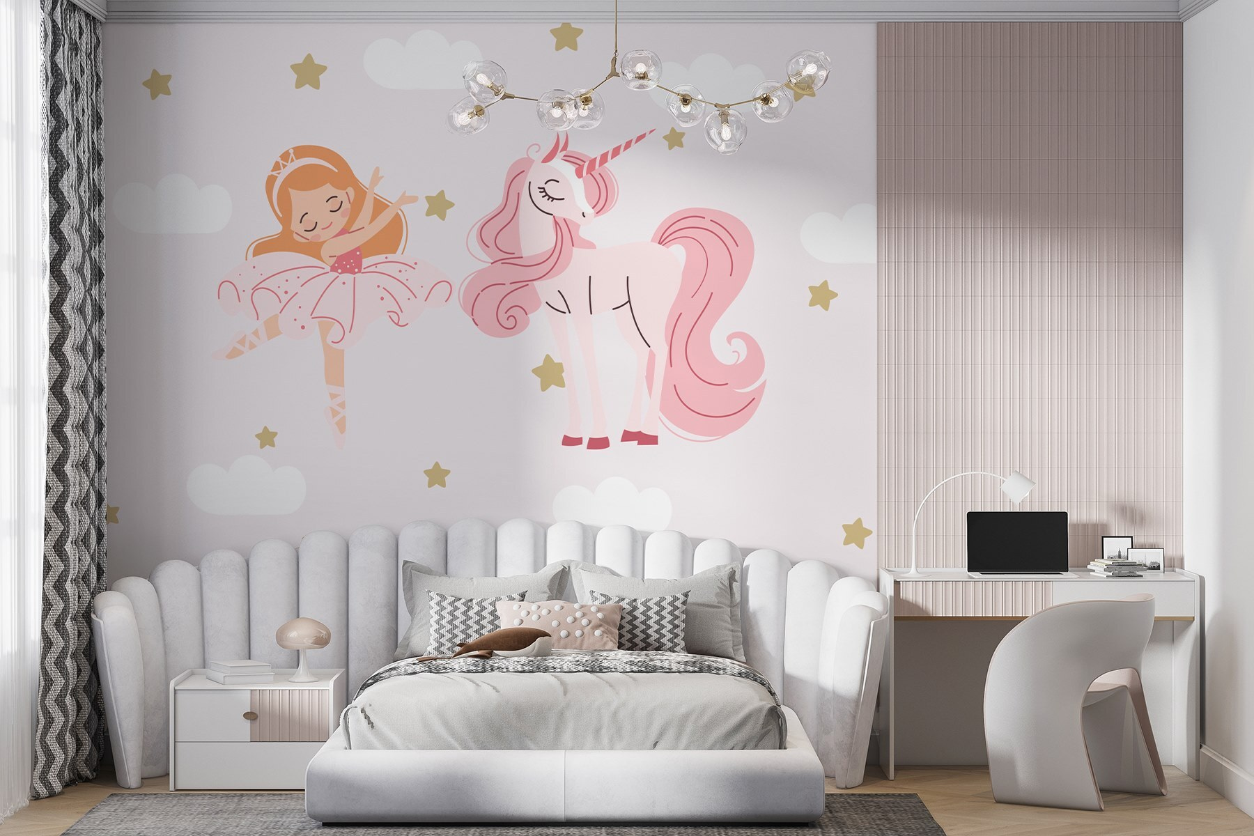 Przekształć przestrzeń każdego dziecka w magiczne królestwo dzięki tej zachwycającej fototapecie ściennej przedstawiającej tancerkę baletową i uroczego jednorożca. Wyobraź to sobie: dzieci wirujące po pokoju, wyobrażające sobie, że biorą udział w wielkim przedstawieniu, podczas gdy ich nowy przyjaciel jednorożec czuwa. Delikatne pastelowe kolory i kapryśne chmurki dodają marzycielskiego charakteru, sprawiając, że nawet drzemka staje się przygodą. Wyobraź sobie chichoty i szeroko otwarte oczy, gdy maluchy dzielą się opowieściami o swoim recitalu tanecznym z jednorożcami. To nie tylko mural; to początek niezliczonych podróży wyobraźni. Kto nie chciałby mieć takiej magii na swoich ścianach?