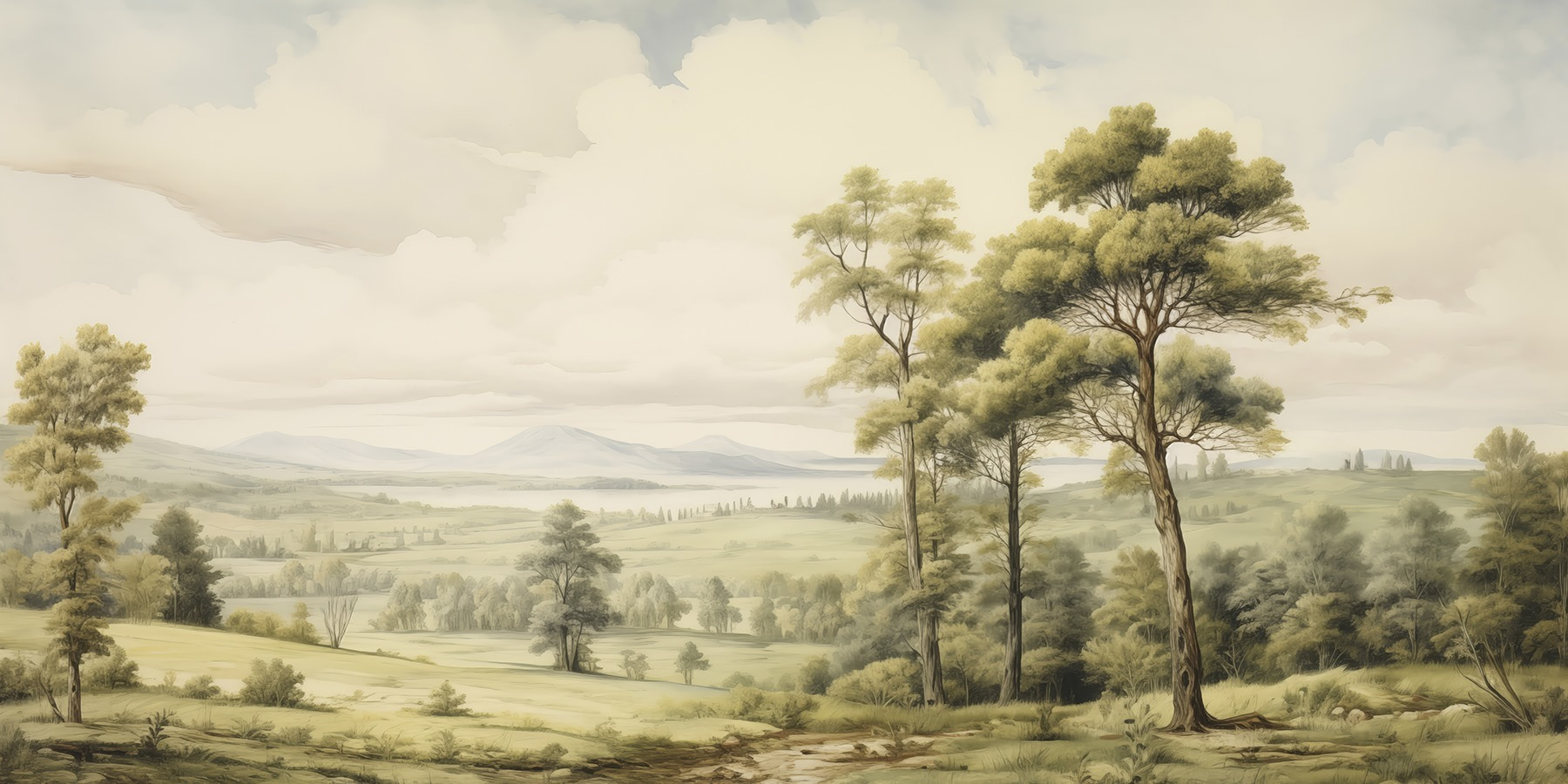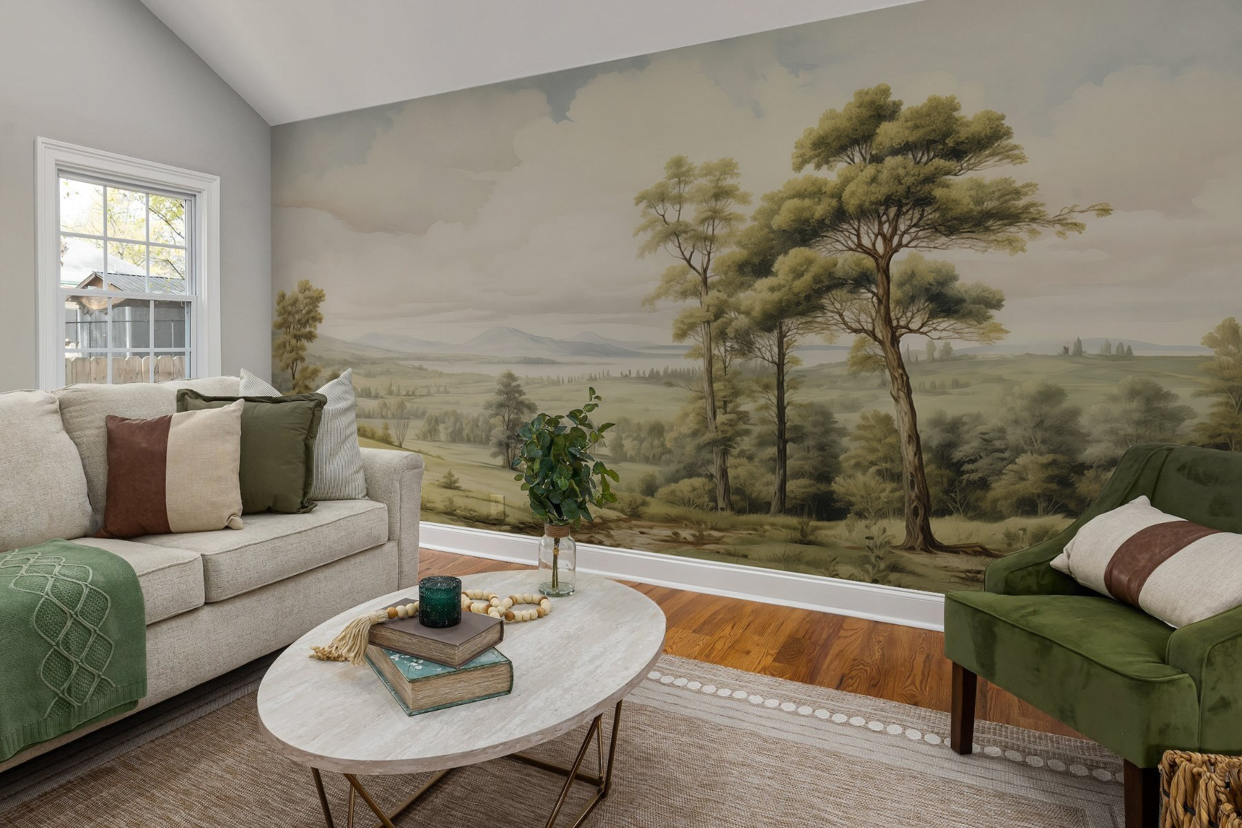 Zmień swoje wnętrze dzięki tej wspaniałej fototapecie „Krajobraz z drzewami i wzgórzami”. Wyobraź sobie, że wkraczasz do spokojnego krajobrazu, gdzie łagodne wzgórza spotykają się z wysokimi drzewami – właśnie tego potrzebuje pomieszczenie, aby nabrać naturalnego charakteru. To jak przeniesienie natury do wnętrza bez martwienia się o podlewanie roślin lub irytujące owady. Wyobraź sobie przytulny kącik do czytania, w którym ta fototapeta stanowi idealne tło, lub jadalnię, która przypomina elegancki piknik. Delikatne kolory działają kojąco, a jednocześnie pobudzają do rozmowy. Przyjaciele mogą nawet zapytać, czy mogą się wprowadzić. To wystrój, który zachęca do marzeń i opowieści – kto by tego nie pokochał? Przygotuj się na tchnienie nowego życia w swoje ściany!