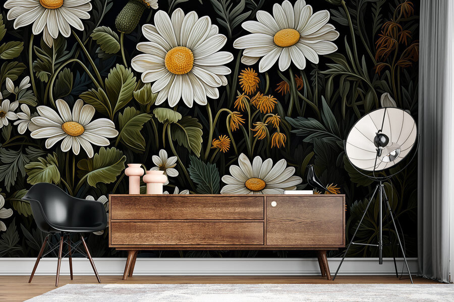 Zmień każde pomieszczenie w botaniczny raj dzięki tej oszałamiającej fototapecie przedstawiającej piękny bukiet kwiatów i liści. Wyobraź sobie, że wchodzisz do swojego pokoju i witają Cię ogromne stokrotki, których radosne płatki niemal szepczą sekrety słonecznych dni. Głębokie tło nadaje jej dramatycznego charakteru, sprawiając, że kwiaty wydają się gotowe na letnią imprezę. Idealna do salonu lub nawet przytulnego kącika, ta fototapeta pozwala naturze zawitać do Ciebie bez konieczności podlewania! Kto nie poczułby się trochę szczęśliwszy, zanurzając się w tej kwiatowej krainie czarów? Niezależnie od tego, czy wywołuje radość, czy po prostu wprowadza odrobinę natury do wnętrza, z pewnością będzie tematem do rozmowy. Więc usiądź wygodnie i ciesz się widokiem!