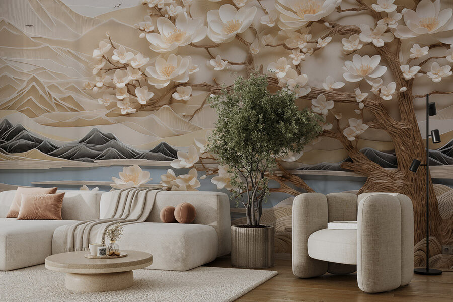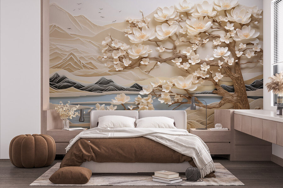 Zmień swoje wnętrze dzięki tej czarującej fototapecie przedstawiającej drzewo ozdobione delikatnymi białymi kwiatami na tle majestatycznych gór. To jak wprowadzenie kawałka natury do wnętrza, bez konieczności zajmowania się ogrodnictwem. Wyobraź sobie, że budzisz się w tej spokojnej scenerii, gdzie delikatne kolory szepczą o spokoju i nutce tajemniczości. Płatki kwiatów wydają się tańczyć na wietrze, zachęcając do marzeń i spokojnych chwil. Idealnie nadaje się do każdego pomieszczenia, które potrzebuje odrobiny elegancji, niezależnie od tego, czy jest to przytulny kącik, czy tętniący życiem salon. Wyobraź sobie filiżankę herbaty w dłoni, patrząc na te góry i czując się, jakbyś znalazł się w spokojnym japońskim ogrodzie, a wszystko to w swoich własnych czterech ścianach. To właśnie ten rodzaj wystroju, który wywołuje uśmiech na twarzy!
