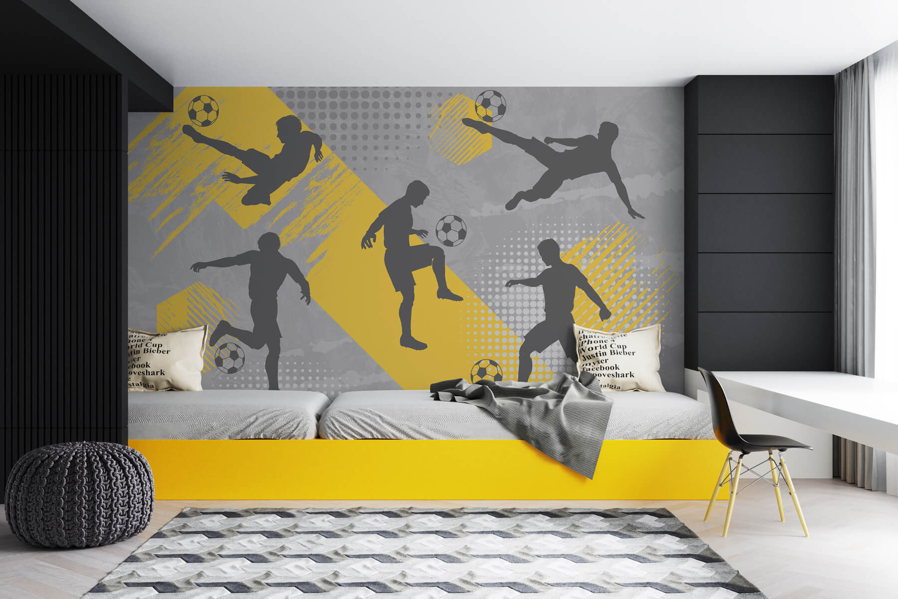 Zmień zwykłą ścianę w dynamiczną scenę dzięki tej żywej fototapecie przedstawiającej mężczyzn grających w piłkę nożną. To tak, jakbyś miał własny mini stadion w domu. Pełne energii sylwetki oddają idealny moment kopnięcia, skoku i całą ekscytację związaną z grą. Wyobraź sobie, że wchodzisz do swojego pokoju i czujesz przypływ adrenaliny, jakbyś miał dołączyć do graczy na boisku. Wyraziste żółcie na tle delikatnych szarości dodają odrobinę radości, ożywiając każdą przestrzeń. Idealny dla entuzjastów sportu lub każdego, kto lubi odrobinę energii w swoim wystroju wnętrz. Przygotuj się na pozbycie się nudy!