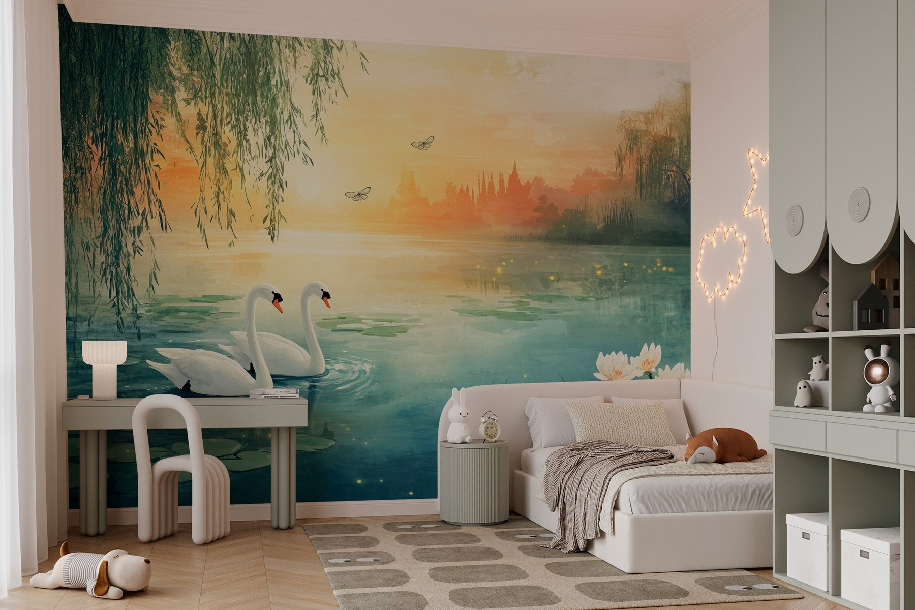Dive into serenity with the “Two Swans in a Lake” mural—it’s like nature’s own hug! This design features graceful swans gliding through a tranquil lake, with soft sunlight filtering through the trees. It’s perfect for turning any room into a peaceful retreat. Imagine sipping your morning coffee, surrounded by this gentle scene, or curling up with a good book as the lovely ambiance takes you far away. The subtle colors and calm vibe add a touch of elegance, making everything feel just a bit more special. Plus, those water lilies? Total show-stoppers! This mural isn’t just decor; it’s an invitation to pause, breathe, and appreciate the little moments. Go ahead, let your walls whisper stories of calm and beauty!