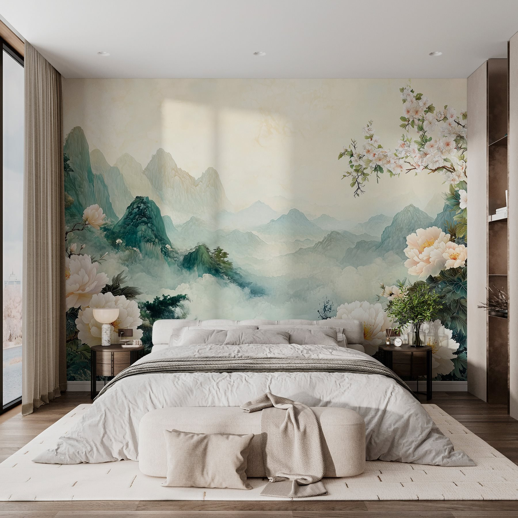 Odmień swoją przestrzeń dzięki tej czarującej fototapecie ściennej przedstawiającej delikatne kwiaty i majestatyczne góry. Wyobraź sobie, że wchodzisz do pokoju, w którym delikatne kwiaty zdają się szeptać tajemnice spokojnych ogrodów, a odległe szczyty wywołują poczucie przygody. Wyobraź sobie, że relaksujesz się na kanapie, popijając herbatę – czujesz się jak w spokojnym japońskim ogrodzie. Ta fototapeta to nie tylko sztuka; przenosi spokój natury do wnętrza, zapraszając do ciepła i zachwytu. Niezależnie od tego, czy jest to przytulny zakątek, czy tętniący życiem salon, dodaje charakteru, wywołując radość przy każdym spojrzeniu. Element do rozmowy? Jak najbardziej!