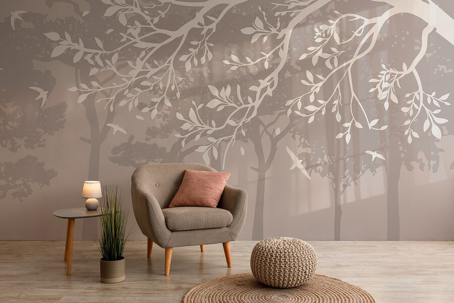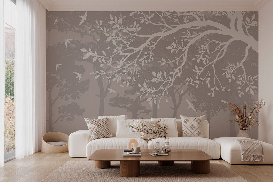 Zmień swoje wnętrze dzięki tej niesamowitej fototapecie, która przedstawia spokojną grupę drzew i ptaki szybujące w powietrzu. To jak wejście do cichego lasu – bez owadów i wilgoci. Wyobraź sobie przytulny salon lub relaksującą sypialnię, gdzie ta fototapeta wprowadza do wnętrza odrobinę natury. Eleganckie gałęzie drzew tańczą na ścianie, tworząc atmosferę spokoju, która sprawia, że prawie zapomina się o stercie prania w kącie. Niezależnie od tego, czy jest to kreatywny kącik, czy miejsce do czytania, ta fototapeta z łatwością otula każde pomieszczenie ciepłem i urokiem. Ponadto jest doskonałym tematem do rozmowy – kto nie chciałby porozmawiać o atmosferze miejskiej dżungli? Odrobina natury jeszcze nikomu nie zaszkodziła, prawda?