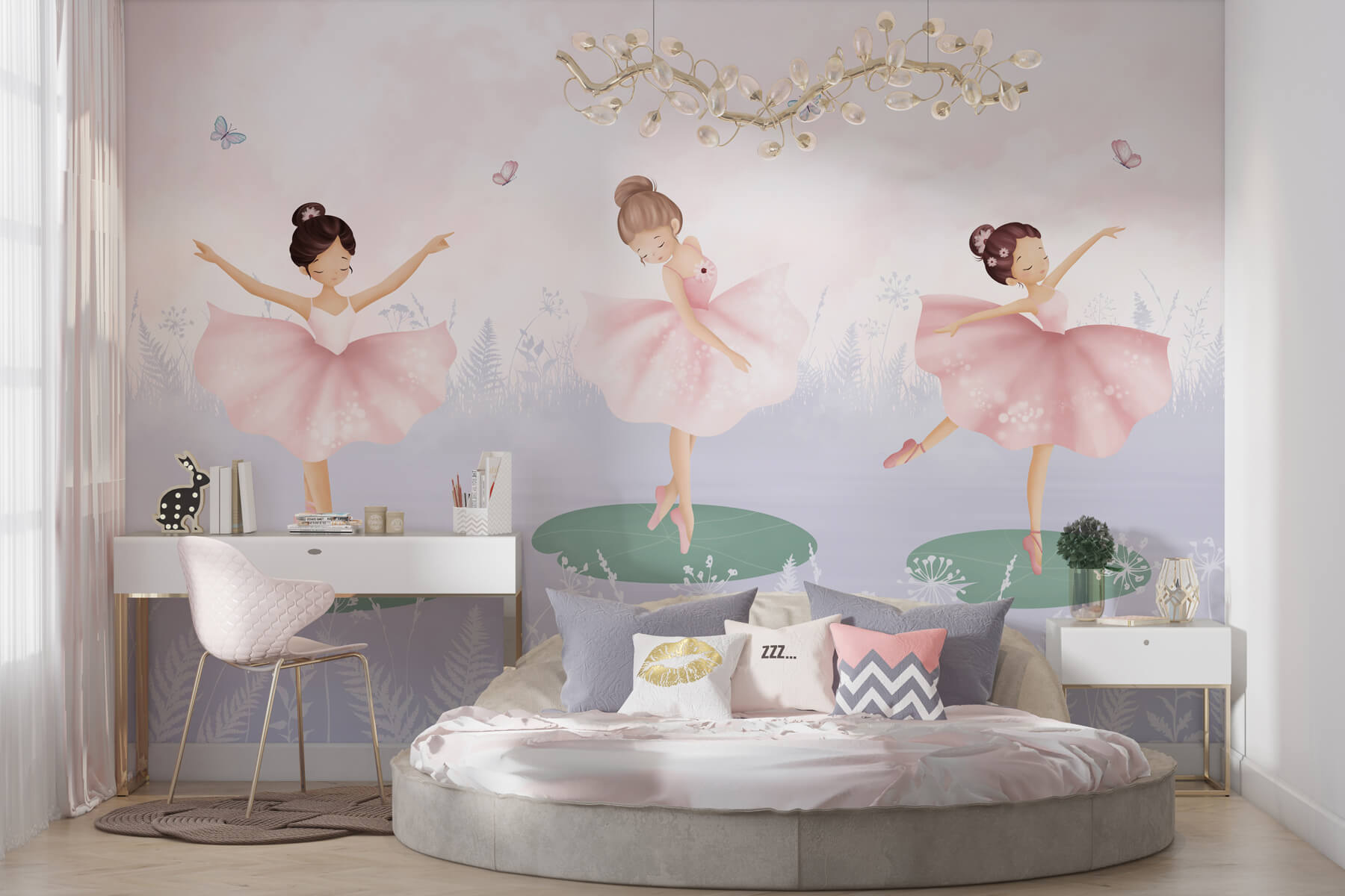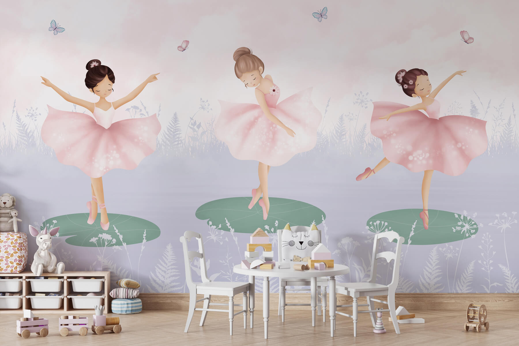 Przekształć pokój dziecka w senną krainę czarów dzięki tej zachwycającej fototapecie przedstawiającej trio dziewczynek w spódniczkach tutu tańczących na liliowych poduszkach. Wyobraź sobie radość na małych twarzach, gdy wchodzą do przestrzeni, w której bajki ożywają. Każda tancerka wiruje z gracją, otoczona przez kapryśne motyle i delikatne pastelowe odcienie, które nadają spokojny ton. To jak wejście do spokojnego baletu, gdzie każde spojrzenie pobudza kreatywność i chichot. Ta fototapeta to nie tylko dekoracja; to portal do wyobraźni, idealny do snucia opowieści o magicznych przygodach w czasie ciszy lub przed snem. Bez wysiłku rozjaśnia każdą ścianę, wnosząc urok i radość, które wypełniają pokój ciepłem i kaprysem.