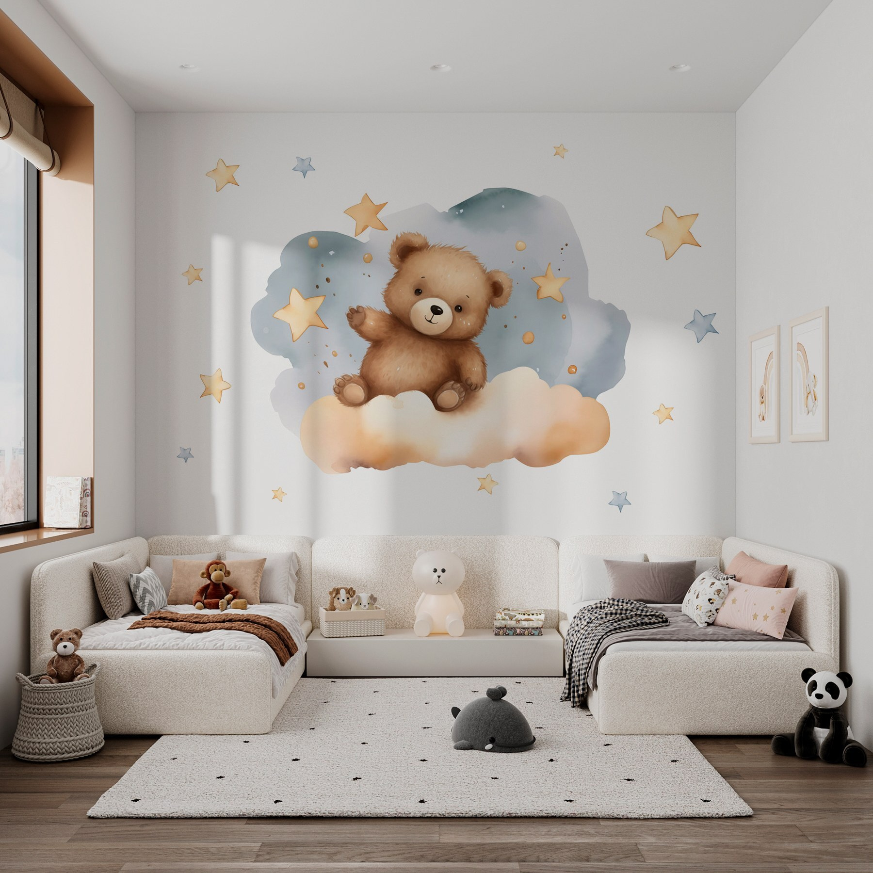 Zmień każdą przestrzeń w bajkową krainę dzięki fototapecie „Pluszowy miś na chmurce”! Wyobraź sobie: puszysty pluszowy miś siedzący na chmurce, machający do Ciebie, jakby właśnie dostrzegł Cię z drugiego końca pokoju. Delikatne odcienie błękitu i żółci tworzą przytulną, spokojną atmosferę — idealną do pokoju dziecięcego lub pokoju zabaw. Wyobraź sobie maluchy wpatrujące się w tę uroczą scenę, zasypiające i śniące o puszystych chmurach i gwiaździstych nocach. Ta fototapeta nie tylko wygląda uroczo, ale także otacza pokój ciepłem i fantazją. To tak, jakby na ścianie siedział magiczny przyjaciel, gotowy zainspirować słodkie sny i niekończące się uśmiechy! Ponadto jest to świetny temat do rozmowy – kto nie zachwyciłby się tak uroczym misiem?