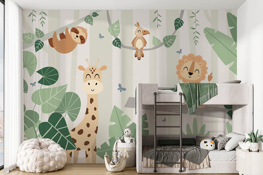 Odmień każdą przestrzeń dzięki tej zachwycającej fototapecie z dżunglą przedstawiającej uroczą obsadę zwierzęcych postaci, w tym wesołą żyrafę, zrelaksowanego leniwca i figlarnego lwa. To jak wejście do zabawnego raju za każdym razem, gdy wchodzisz do pokoju. Wyobraź sobie dzieci chichoczące w otoczeniu bujnej zieleni i futrzanych przyjaciół – mogą nawet udawać, że są odkrywcami na ekscytującym safari! Każdy szczegół daje poczucie zabawy i zachwytu, idealne do pobudzenia wyobraźni. Ta fototapeta nie tylko rozjaśnia ściany, ale także wprowadza beztroski nastrój do zabawy, przed snem lub w dowolnym momencie. Kto nie chciałby mieć w domu swojego własnego azylu w dżungli?