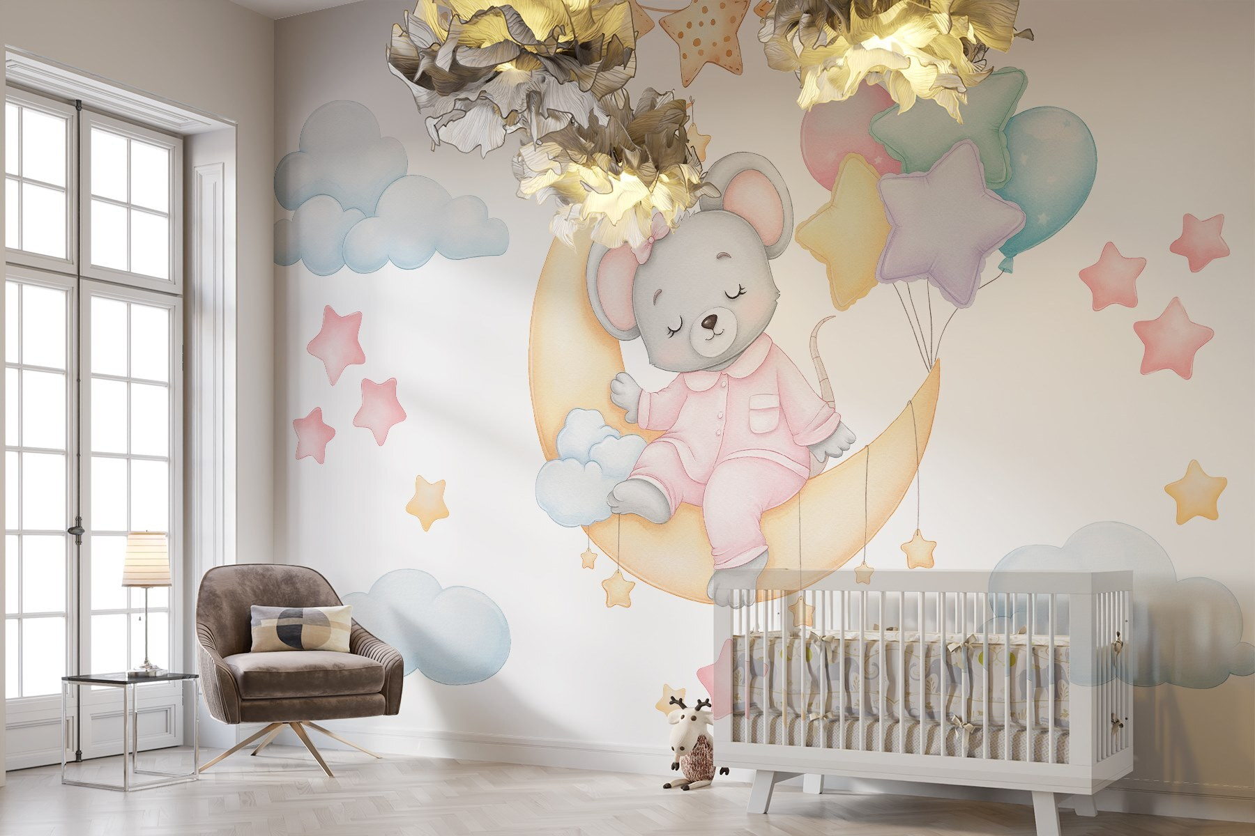 Przekształć dowolny pokój w senną ucieczkę dzięki tej czarującej fototapecie ściennej przedstawiającej myszkę przytuloną do księżyca, ściskającą kolorowe balony. Wyobraź sobie delikatny blask oświetlający te maleńkie gwiazdki, podczas gdy twój maluch zasypia, śniąc o kapryśnych przygodach wśród chmur. To jak bajka na dobranoc – idealna do pokoju dziecięcego lub pokoju zabaw! Pastelowa paleta tworzy kojącą atmosferę, dzięki czemu łatwo wyobrazić sobie wszystkie chichoty i słodkie sny, które może zainspirować ta urocza scena. Dodaj odrobinę magii do ścian i pozwól wyobraźni unieść się w górę!