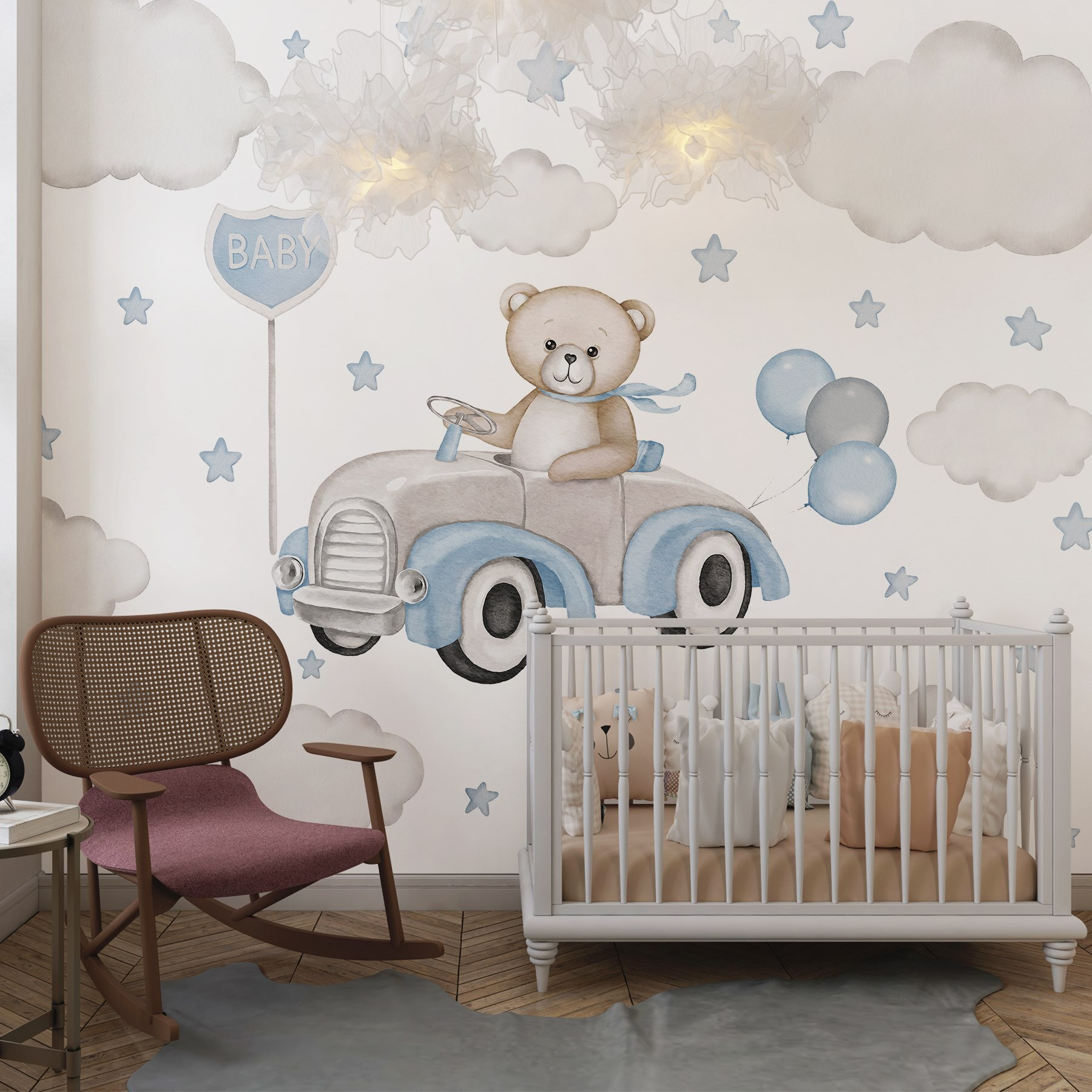 Przekształć dziecięcą przestrzeń w przygodę dzięki tej uroczej fototapecie przedstawiającej misia pędzącego w uroczym samochodzie, trzymającego kolorowe balony. To jak mała scena z bajki na ścianie! Wyobraź sobie zachwyt na twarzy swojego malucha za każdym razem, gdy wejdzie do pokoju. Zabawne kolory i kapryśny design tworzą idealny nastrój do snucia wielkich marzeń. Dodatkowo, puszyste chmurki i migoczące gwiazdki dodają odrobinę magii. To nie tylko wystrój; to zaproszenie do radosnych marzeń i nieograniczonej wyobraźni. Kto nie chciałby wskoczyć do tego samochodu na przejażdżkę?