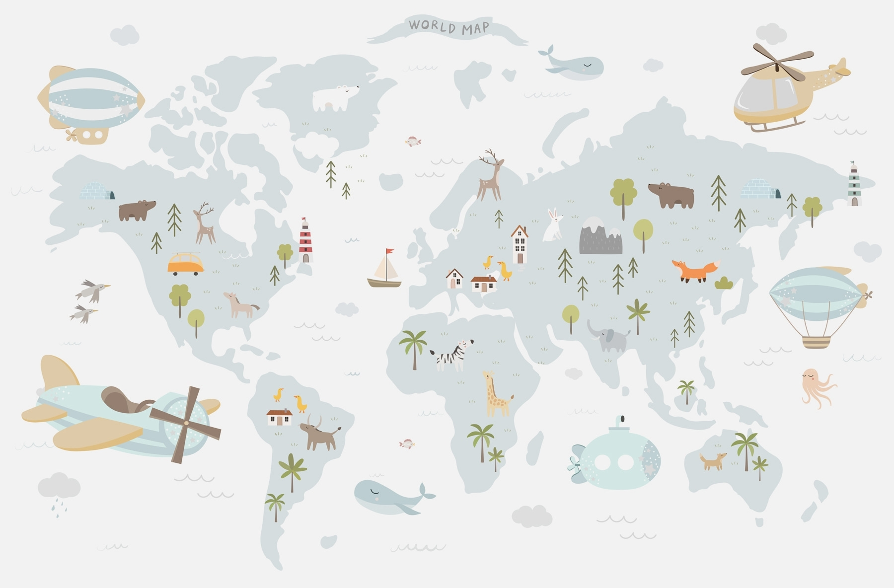 Odmień swoją przestrzeń dzięki kapryśnemu urokowi fototapety ściennej Mapa świata. Ta zachwycająca fototapeta zabierze Cię w podróż przez kontynenty bez konieczności posiadania paszportu. Wyobraź sobie, że twarze dzieci rozjaśniają się, gdy dostrzegają zabawne zwierzęta, żaglówki, a nawet balony na ogrzane powietrze rozsiane po całym świecie. To jak mini przygoda bezpośrednio na ścianie! Ta fototapeta jest nie tylko ładna, ale także zachęca do rozmowy, pobudzając marzenia o odległych miejscach. Idealna do pokoju dziecięcego lub tętniącego życiem placu zabaw, z pewnością wywoła uśmiech, a może nawet odrobinę inspiracji dla przyszłych odkrywców. Któż nie chciałby marzyć z tak wesołym tłem?