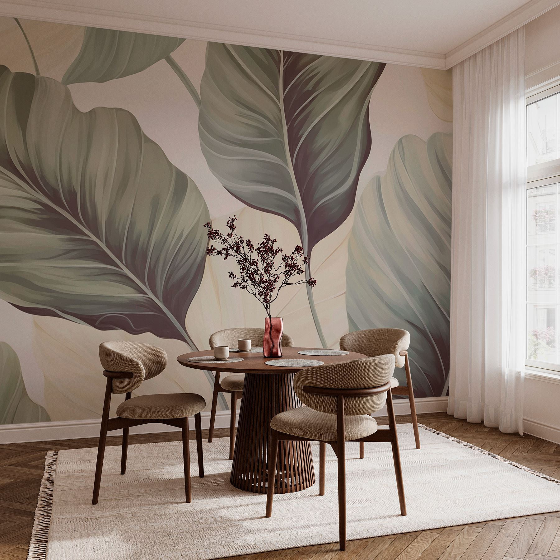 Przekształć dowolny pokój w spokojną ucieczkę dzięki tej oszałamiającej fototapecie ściennej z eleganckimi liściastymi wzorami, które szepczą spokój natury. Wyobraź sobie, że wchodzisz do przytulnego zakątka, gdzie delikatna zieleń i miękka biel tworzą kojące tło. To tak, jakby przenieść kawałek wewnętrznego ogrodu bezpośrednio do swojej przestrzeni życiowej. Idealny na te dni, kiedy chcesz się zrelaksować przy filiżance herbaty lub dobrej książce. Co więcej, ten design pasuje do różnych stylów – niezależnie od tego, czy twój klimat jest minimalistyczny, czy nieco boho. Dodaj kilka wygodnych poduszek i voilà, natychmiastowa strefa relaksu!