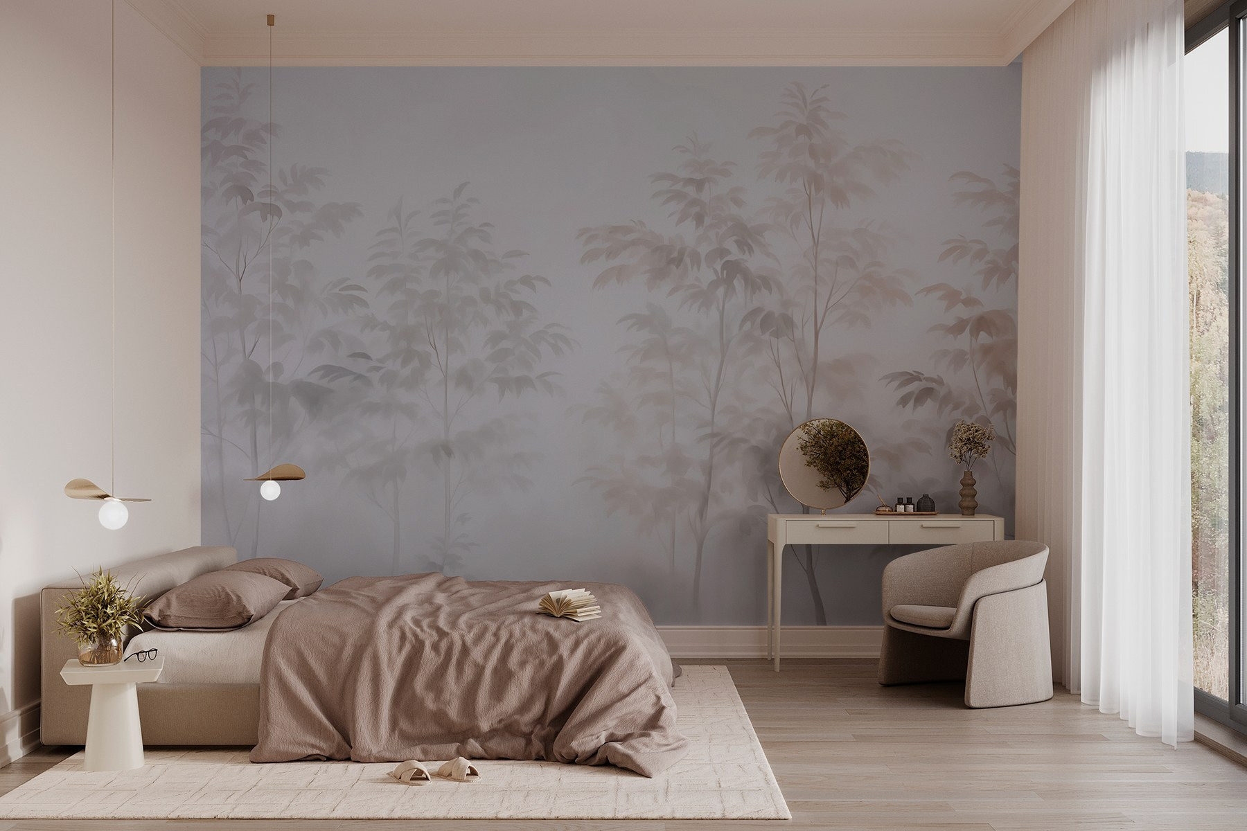 Odmień swoją przestrzeń dzięki kolekcji “Trees in the Fog”, w której eteryczne sylwetki drzew z wdziękiem łączą się z delikatną mgłą. To jak wejście do spokojnego lasu bez wychodzenia z domu. Wyobraź sobie, że popijasz kawę, wpatrując się w tę delikatną scenę – jest uspokajająca, niemal medytacyjna. Stonowane odcienie tworzą kojące tło, idealne do salonów lub przytulnych zakątków. Przyjaciele mogą powiedzieć, że to jak tajemniczy sen, sekretny las ukrywający się tuż za ścianą! Przenieś kawałek natury do wnętrza i poczuj, jak twoje zmartwienia rozpływają się we mgle. Wystarczy dodać wygodne poduszki i może dobrą książkę.