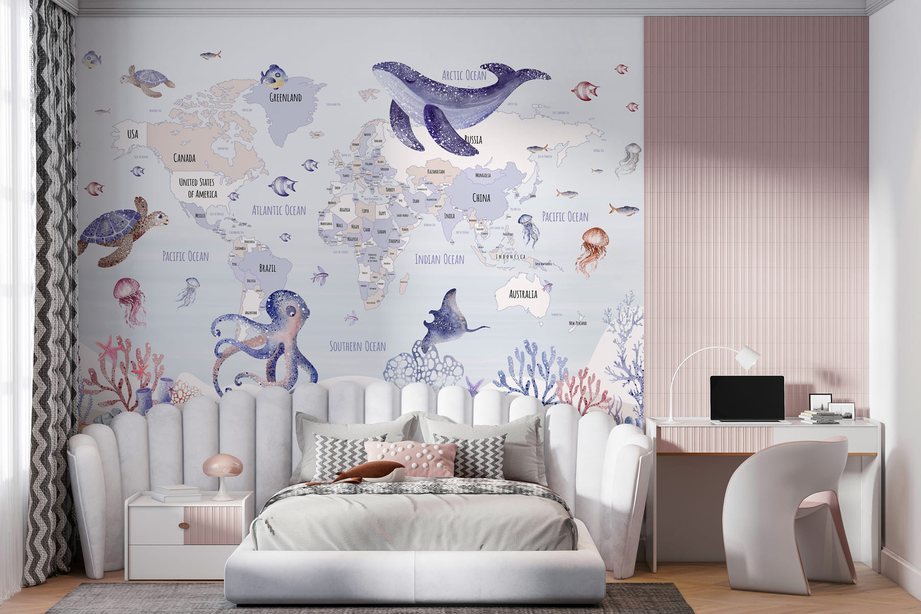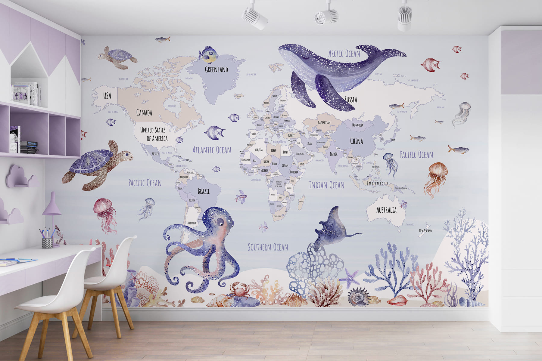 Przekształć każdy pokój w mini przygodę dzięki tej zachwycającej fototapecie ściennej, przedstawiającej uroczą mapę świata otoczoną plamą morskiego życia. Wyobraź sobie, ile uśmiechu wywoła, zapraszając małych odkrywców do poznawania odległych krain w otoczeniu kapryśnych żółwi, figlarnych ośmiornic i łagodnych wielorybów. To nie tylko fototapeta; to jak posiadanie własnej opowieści o tematyce oceanicznej, która czeka na rozwinięcie. Idealna do pokoju zabaw lub przytulnego kącika, rozbudzi ciekawość, rozpali wyobraźnię, a może nawet zamieni nudny wtorek w morskie marzenia. Kto wie, może to zainspiruje przyszłego biologa morskiego!