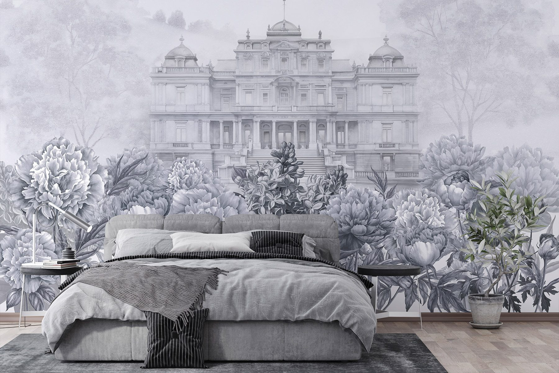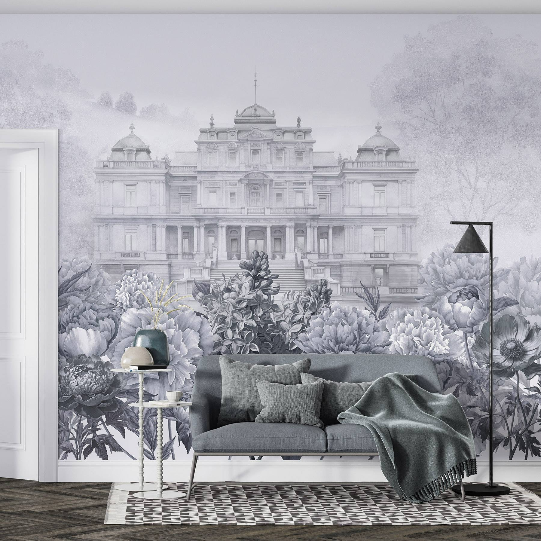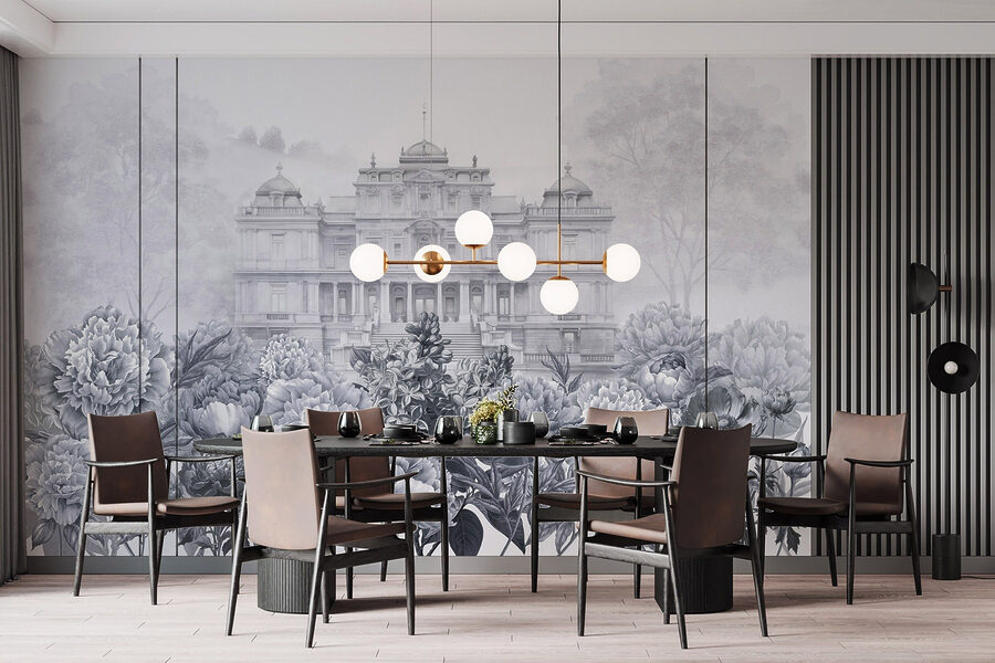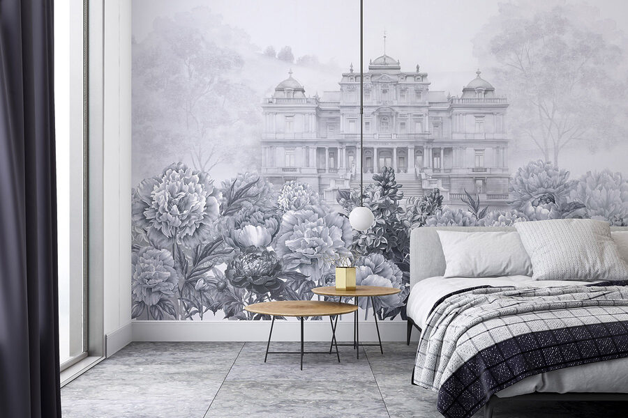 Wejdź do świata, w którym elegancja spotyka się z naturą dzięki tej oszałamiającej fototapecie. Wyobraź sobie okazały biały budynek wyglądający przez bujny ogród piwonii, zachęcający do marzeń o popołudniowej herbacie na oświetlonym słońcem tarasie. Delikatne odcienie szarości tworzą uspokajające tło, idealne do relaksu po długim dniu. Przyjaciele zatrzymają się w połowie rozmowy, urzeczeni wyjątkowym pięknem. To jak przeniesienie smaku europejskiej posiadłości do salonu, ale bez wysokiej ceny. Umieść to piękno na ścianie i obserwuj, jak twoja przestrzeń rozkwita!