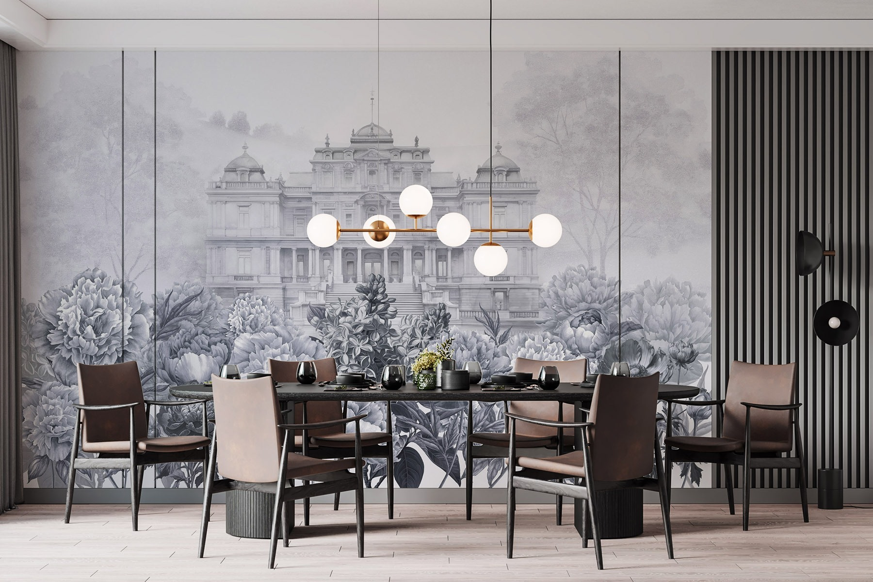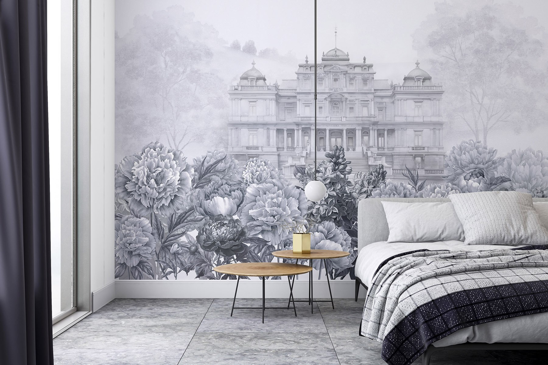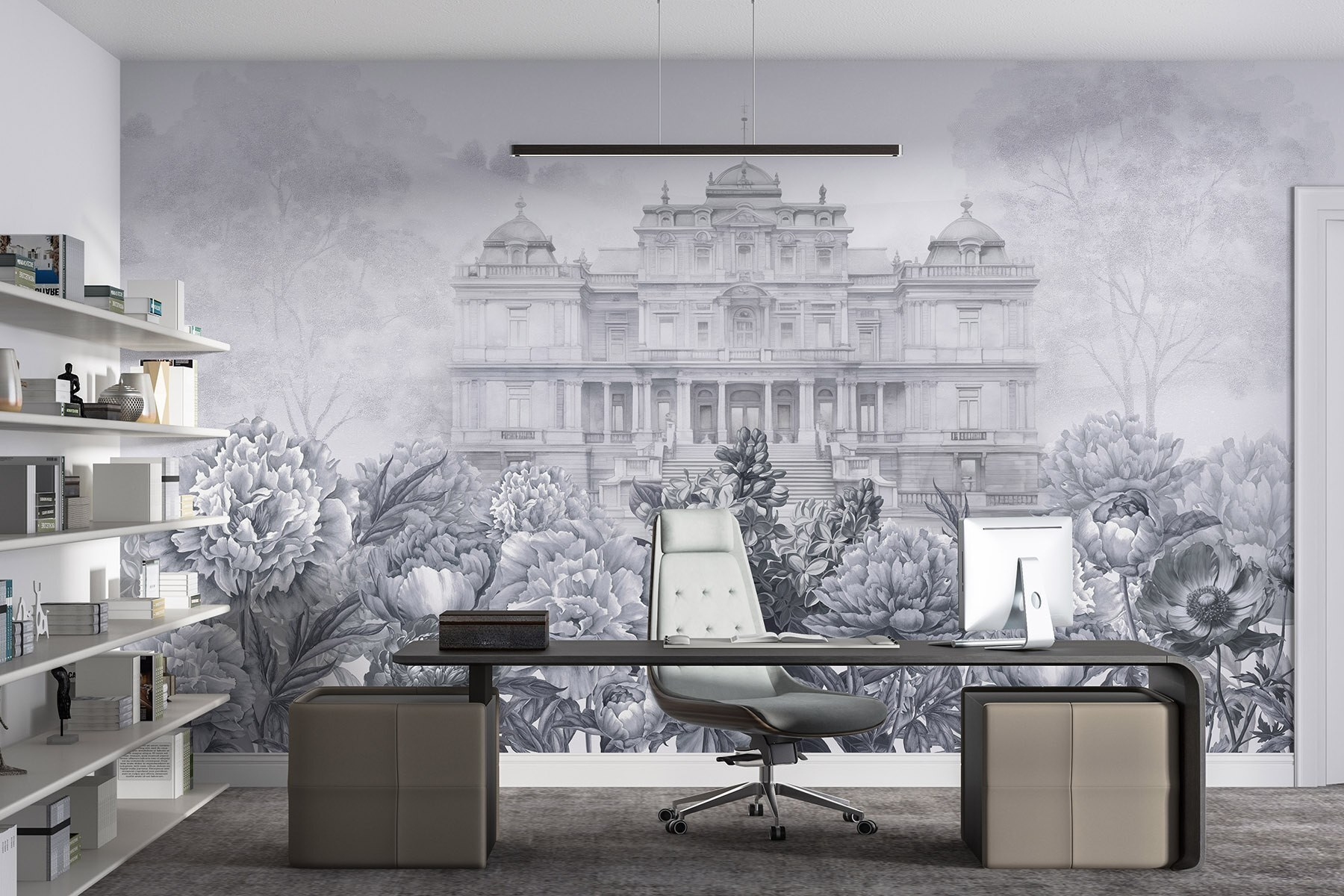 Wejdź do świata, w którym elegancja spotyka się z naturą dzięki tej oszałamiającej fototapecie. Wyobraź sobie okazały biały budynek wyglądający przez bujny ogród piwonii, zachęcający do marzeń o popołudniowej herbacie na oświetlonym słońcem tarasie. Delikatne odcienie szarości tworzą uspokajające tło, idealne do relaksu po długim dniu. Przyjaciele zatrzymają się w połowie rozmowy, urzeczeni wyjątkowym pięknem. To jak przeniesienie smaku europejskiej posiadłości do salonu, ale bez wysokiej ceny. Umieść to piękno na ścianie i obserwuj, jak twoja przestrzeń rozkwita!